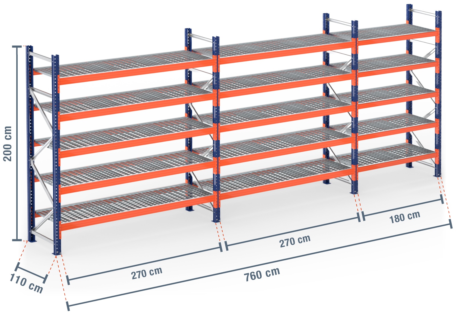 7,6 m Palettenregal PR9000 / 110 cm tief / 2 m hoch / 5 Ebenen / Auflage Gitterrost