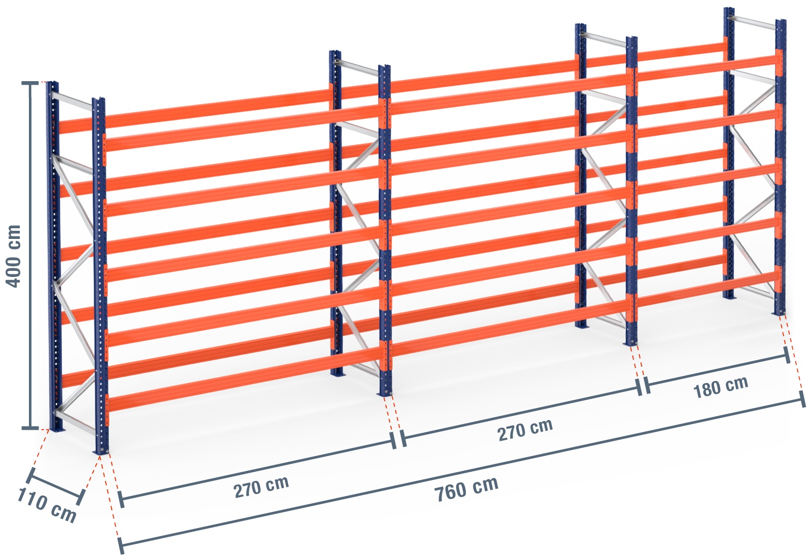 Die Traversen sind pulverbeschichtet in auffälligem Orange, um für Sicherheit am Arbeitsplatz zu sorgen. Sie werden einfach in Steckbauweise in die Regalständer eingehängt. Zusätzliche Sicherungsstifte schützen die Traverse vor versehentlichem Heraushebeln und sorgen so für Sicherheit. Die Palettenregalständer bestehen aus zwei pulverbeschichteten Ständerprofilen in Blau. Das vordere und das hintere Ständerprofil werden mit Hilfe von Quer- und Diagonalstreben miteinander verschraubt und erlauben so eine besonders große Standfestigkeit. Um diese zusätzlich zu gewährleisten werden 2 Fußplatten pro Regalständer an den unteren Enden montiert und mit Bolzenankern fest im Boden verankert. Dadurch ist unser modulares Palettenregal nicht nur individualisierbar, sondern auch besonders sicher durch die Fixierung im Untergrund.