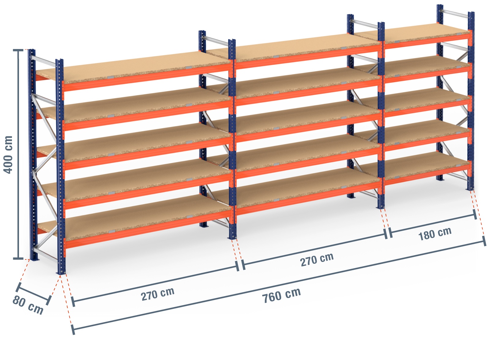 7,6 m Palettenregal PR9000 / 80 cm tief / 4 m hoch / 5 Ebenen / Auflage Holz