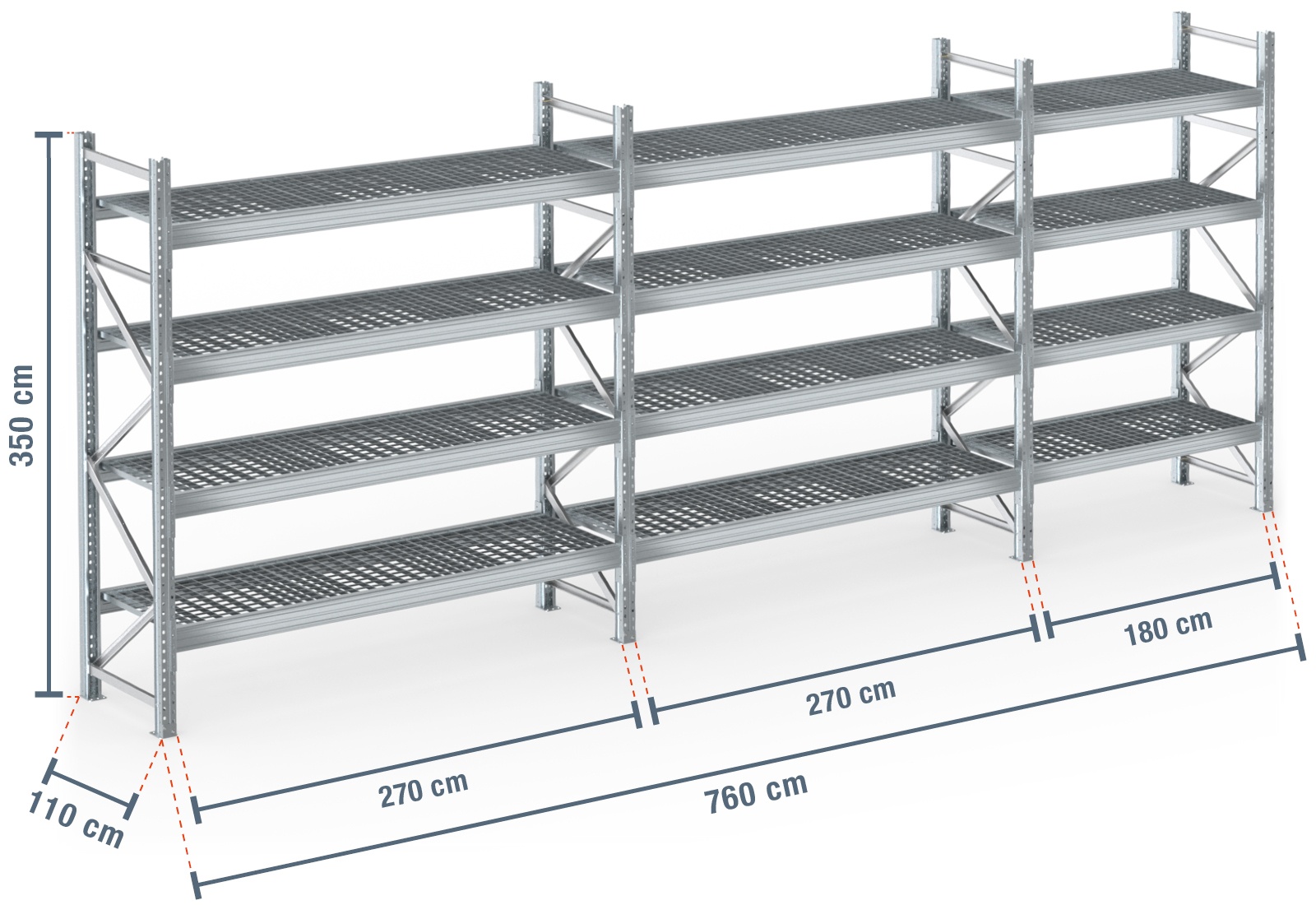 7,6 m Palettenregal PR9000F Feuerverzinkt / 110 cm tief / 3,5 m hoch / 4 Ebenen / Auflage Gitterrost