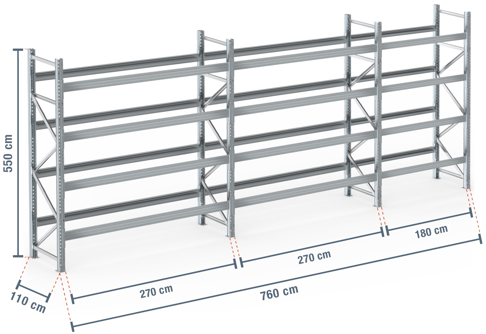 7,6 m Palettenregal PR9000F Feuerverzinkt / 110 cm tief / 5,5 m hoch / 4 Ebenen für 40 Europaletten
