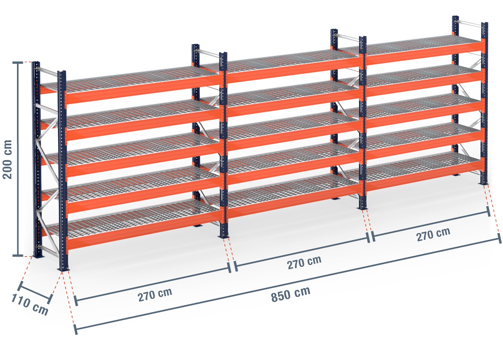 8,5 m Palettenregal PR15000 / 110 cm tief / 2 m hoch / 5 Ebenen / Auflage Gitterrost
