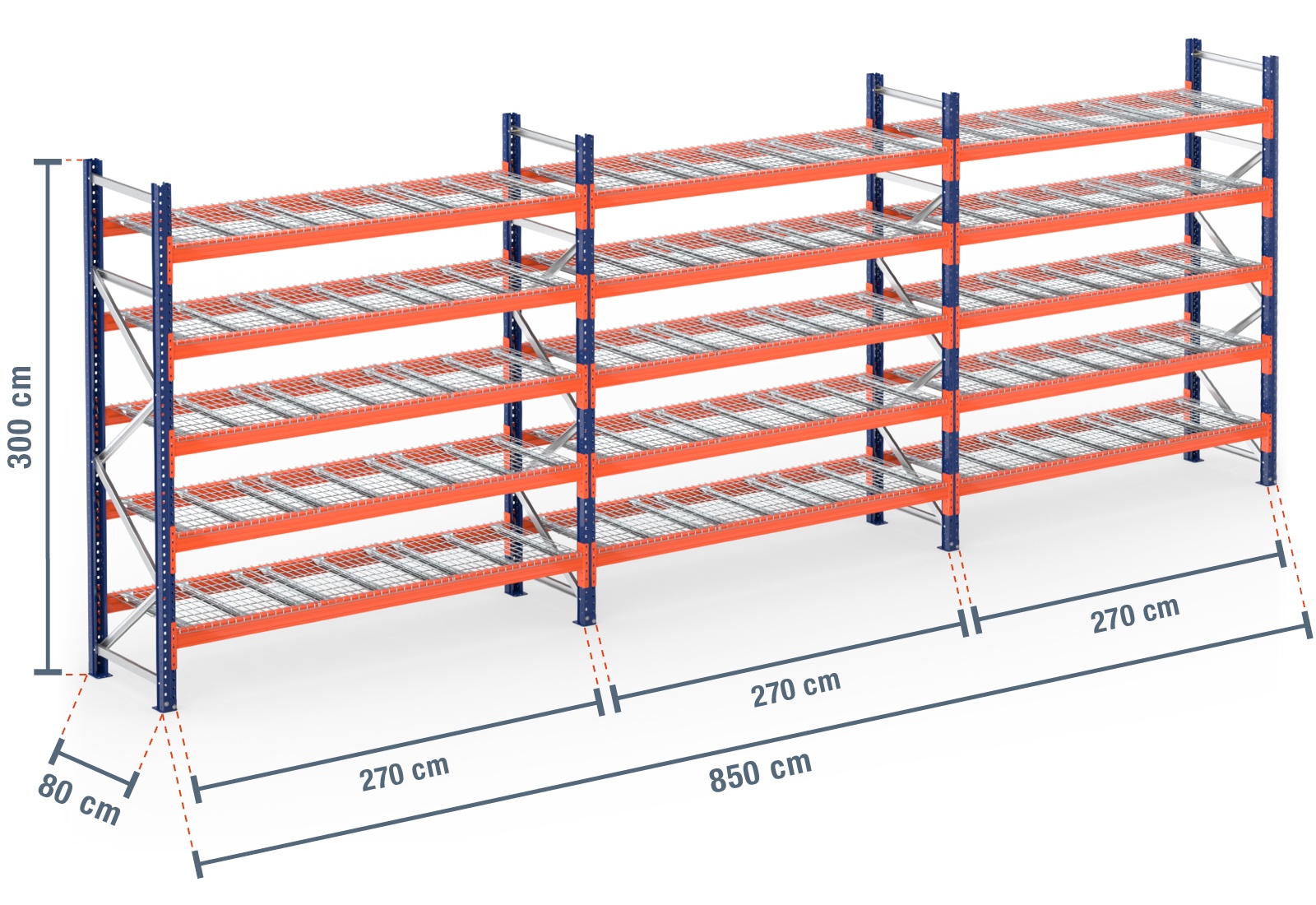 8,5 m Palettenregal PR9000 / 80 cm tief / 3 m hoch / 5 Ebenen / Auflage Drahtgitter