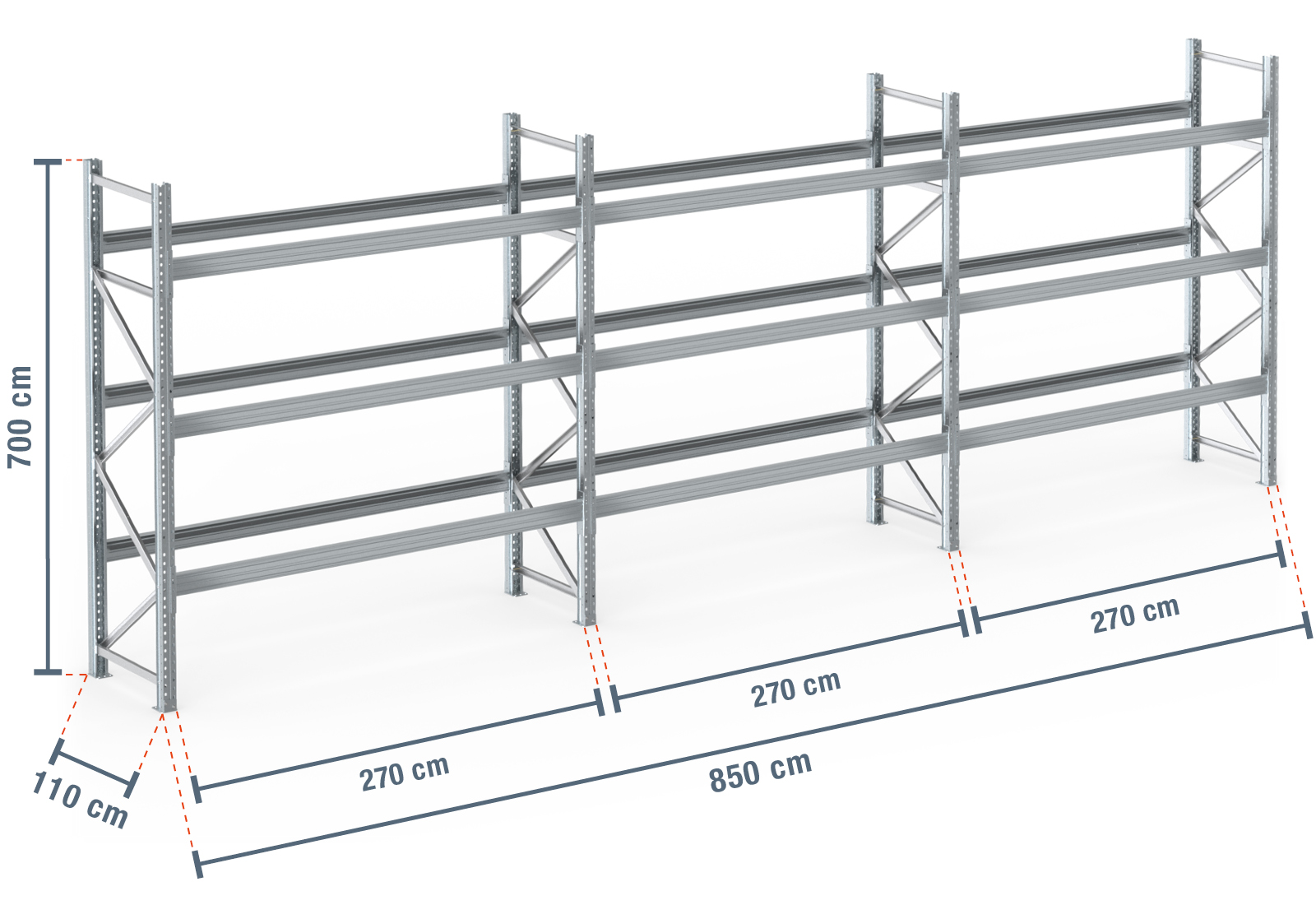 8,5 m Palettenregal PR9000F Feuerverzinkt / 110 cm tief / 7 m hoch / 3 Ebenen für 36 Europaletten