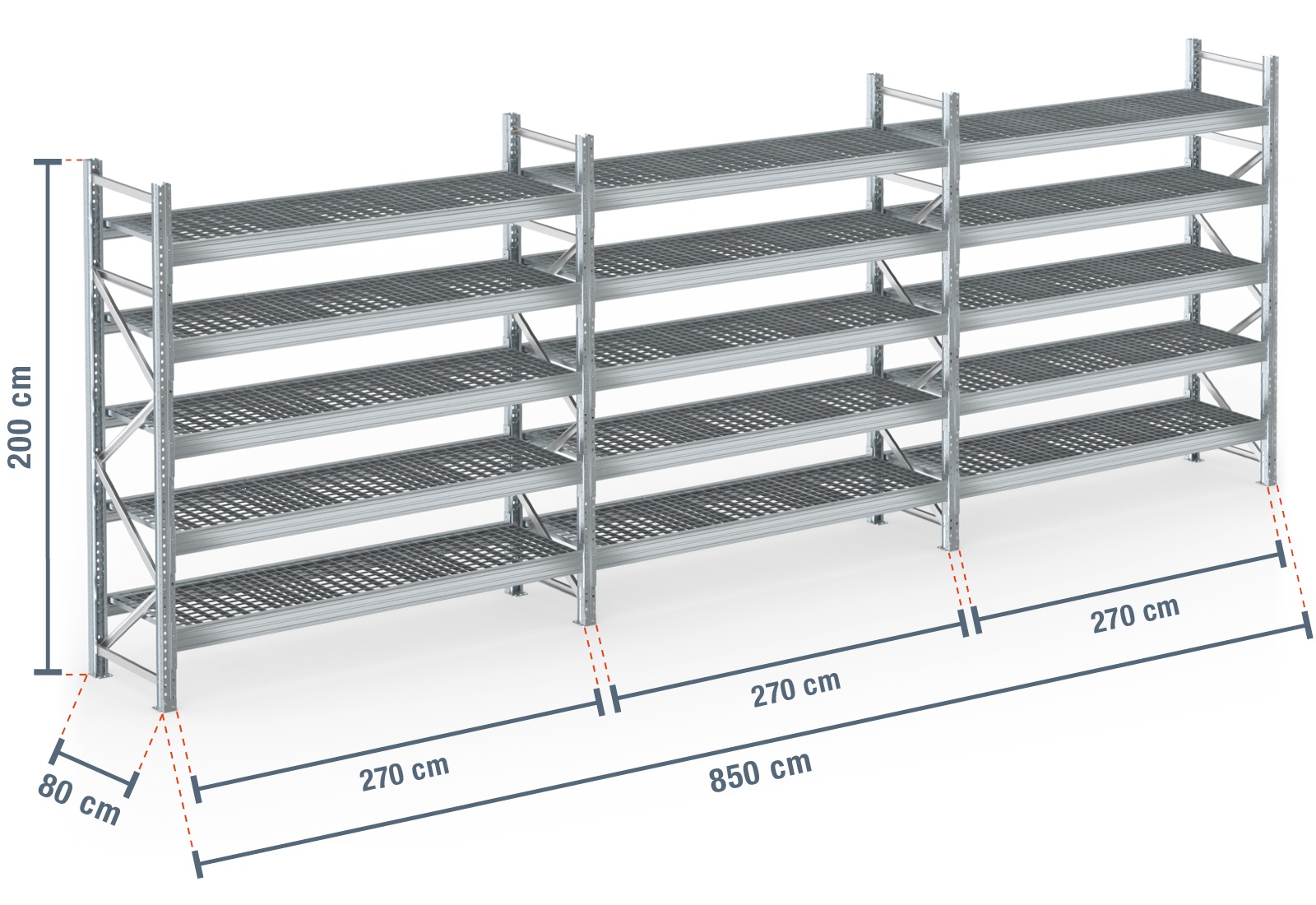 8,5 m Palettenregal PR9000F Feuerverzinkt / 80 cm tief / 2 m hoch / 5 Ebenen / Auflage Gitterrost