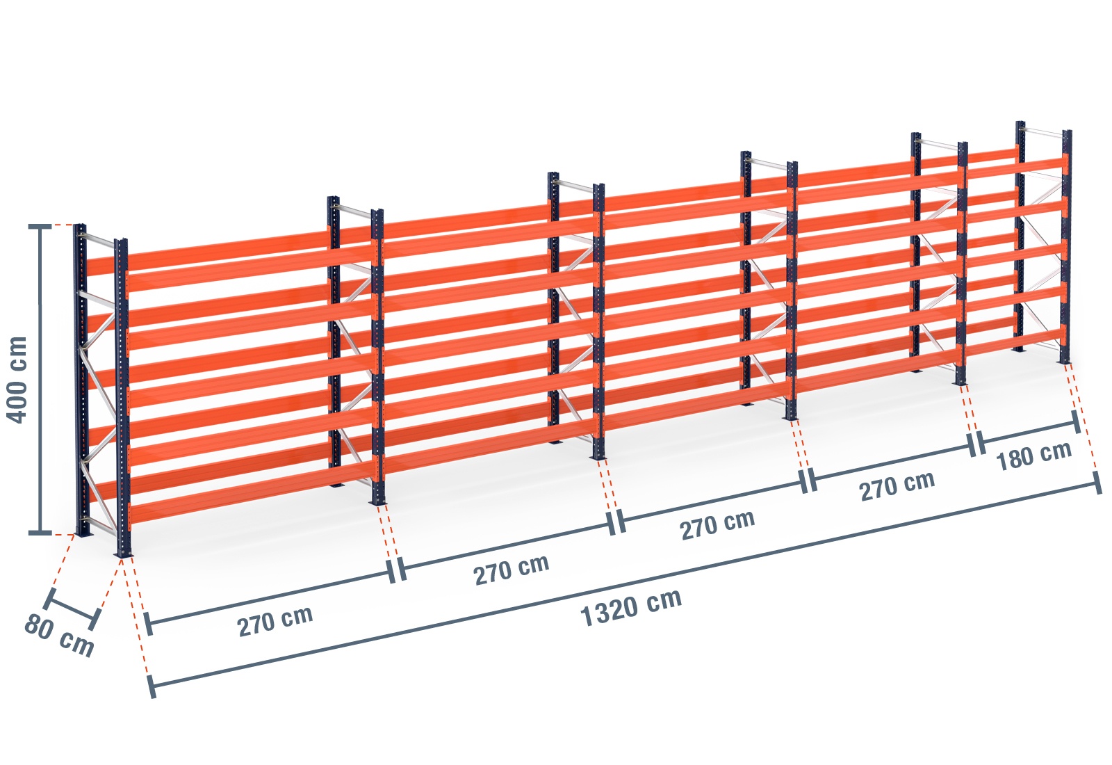 13,2 m Palettenregal PR15000 / 80 cm tief / 4 m hoch / 5 Ebenen für 84 Europaletten