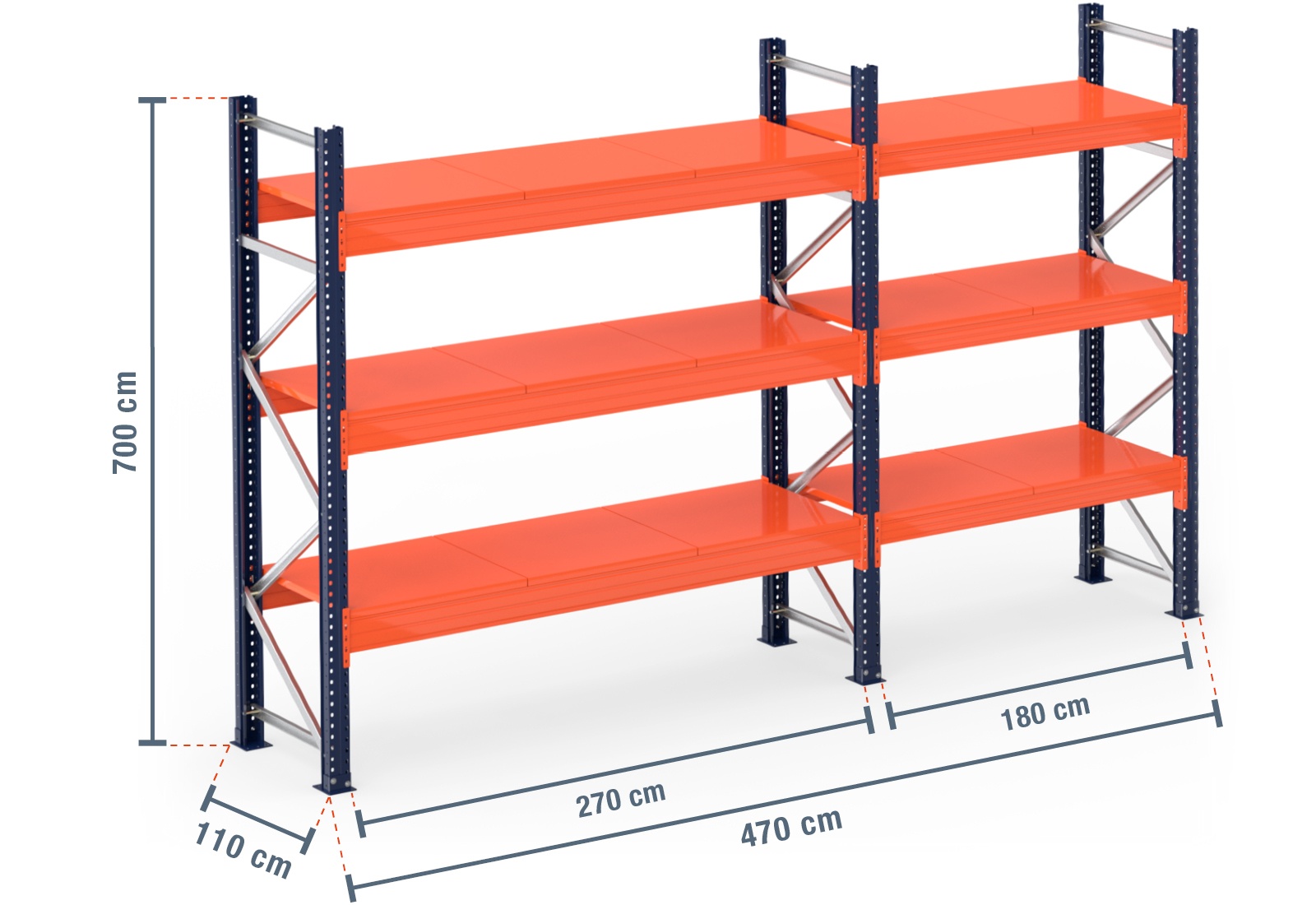 4,7 m Palettenregal PR15000 / 110 cm tief / 7 m hoch / 3 Ebenen / Auflage Stahl