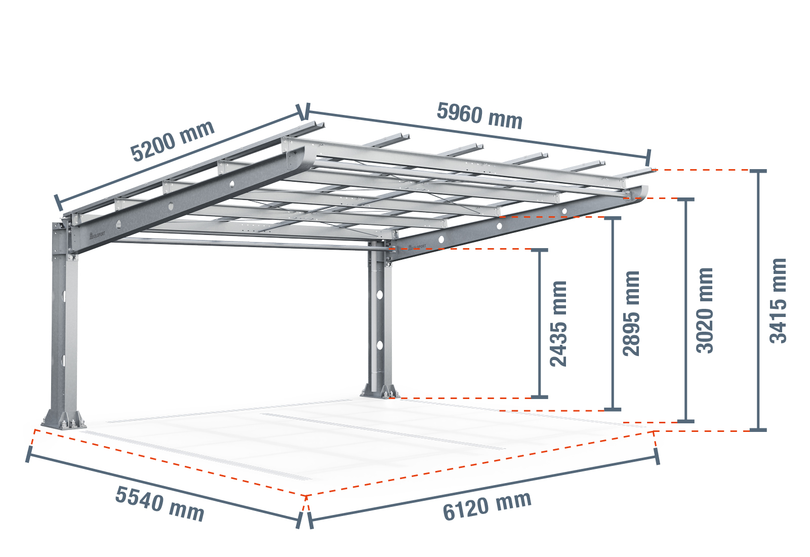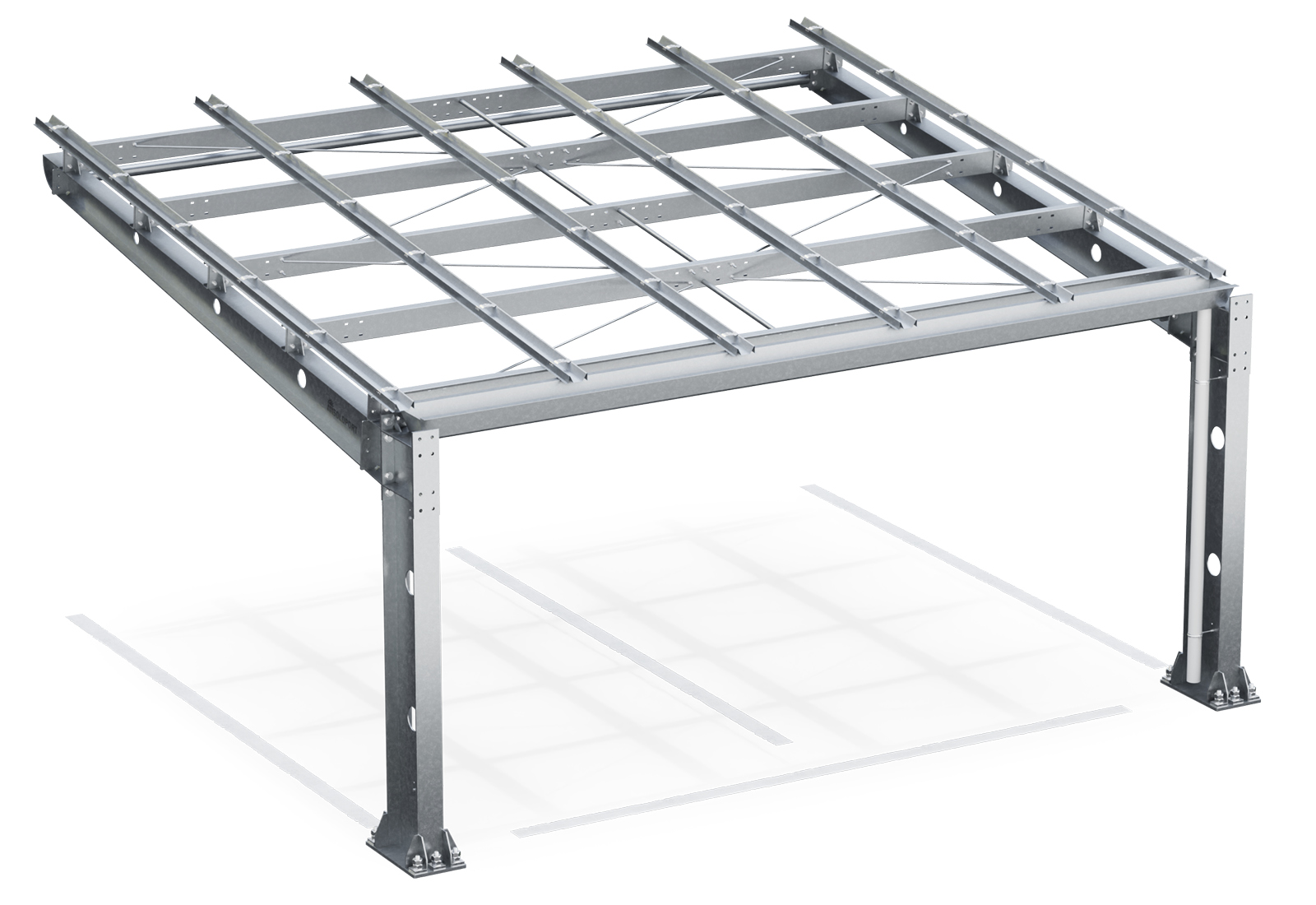 Aufgrund der Verarbeitung von robustem, stabilem und feuerverzinktem Stahl ist die Gestellkonstruktion korrosionsbeständig, hagel- und frostsicher. Dank der freitragenden Bauweise mit den kompakten Maßen 6.120 mm x 5.450 mm x 3.410 mm ist keine komplette Umgestaltung ihres Parkplatzes für den Aufbau erforderlich. Mit Hilfe eines integriertes Regenrinnensystem kann Regenwasser aufgefangen, gesammelt und beispielsweise zur Bewässerung von Grünflächen genutzt werden.