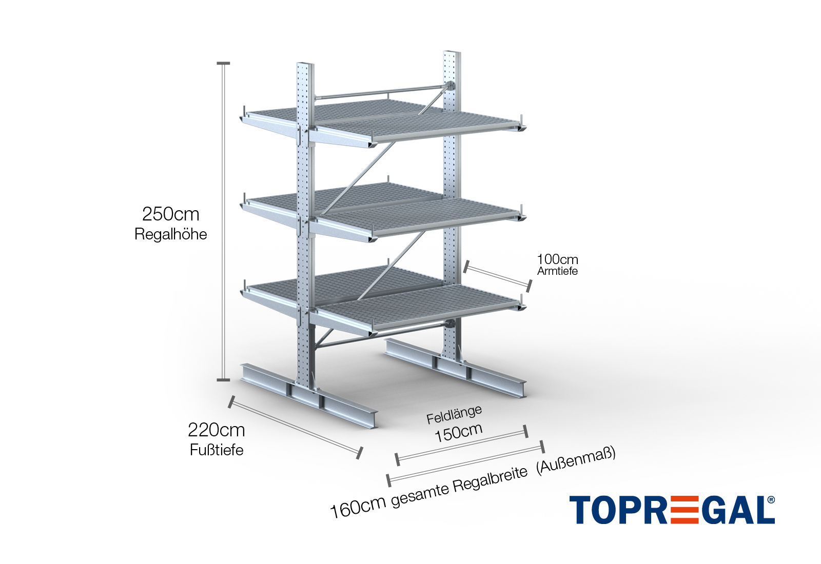 1,6 m cantilever rack KR3000 / Hot-dip galvanised / Double-sided / 2,5 m high / 100 cm cantilever depth / 3 levels / rack layer Galvanised mesh