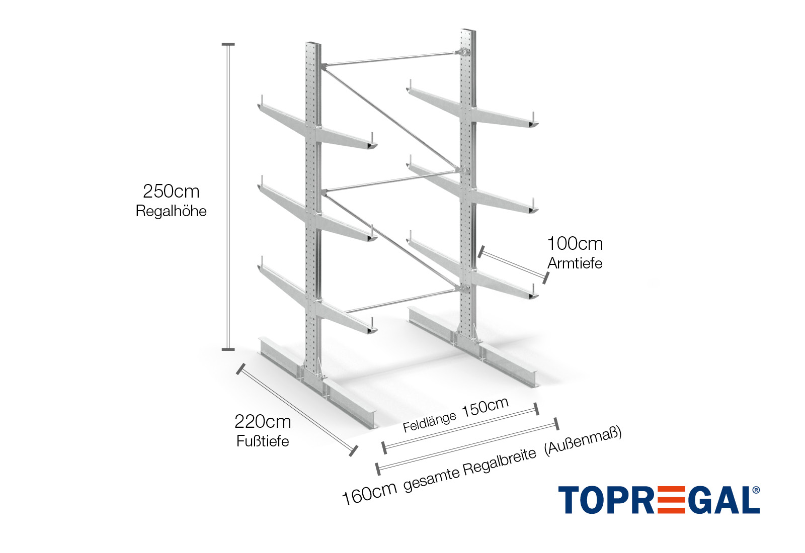 1,6 m cantilever rack KR3000 / Hot-dip galvanised / Double-sided / 2,5 m high / 100 cm cantilever depth / 3 levels