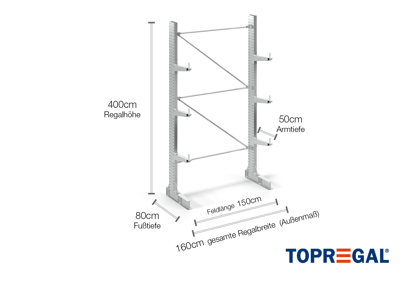 1,6 m cantilever rack KR3000 / Hot-dip galvanised / One-sided / 4 m high / 50 cm cantilever depth / 3 levels