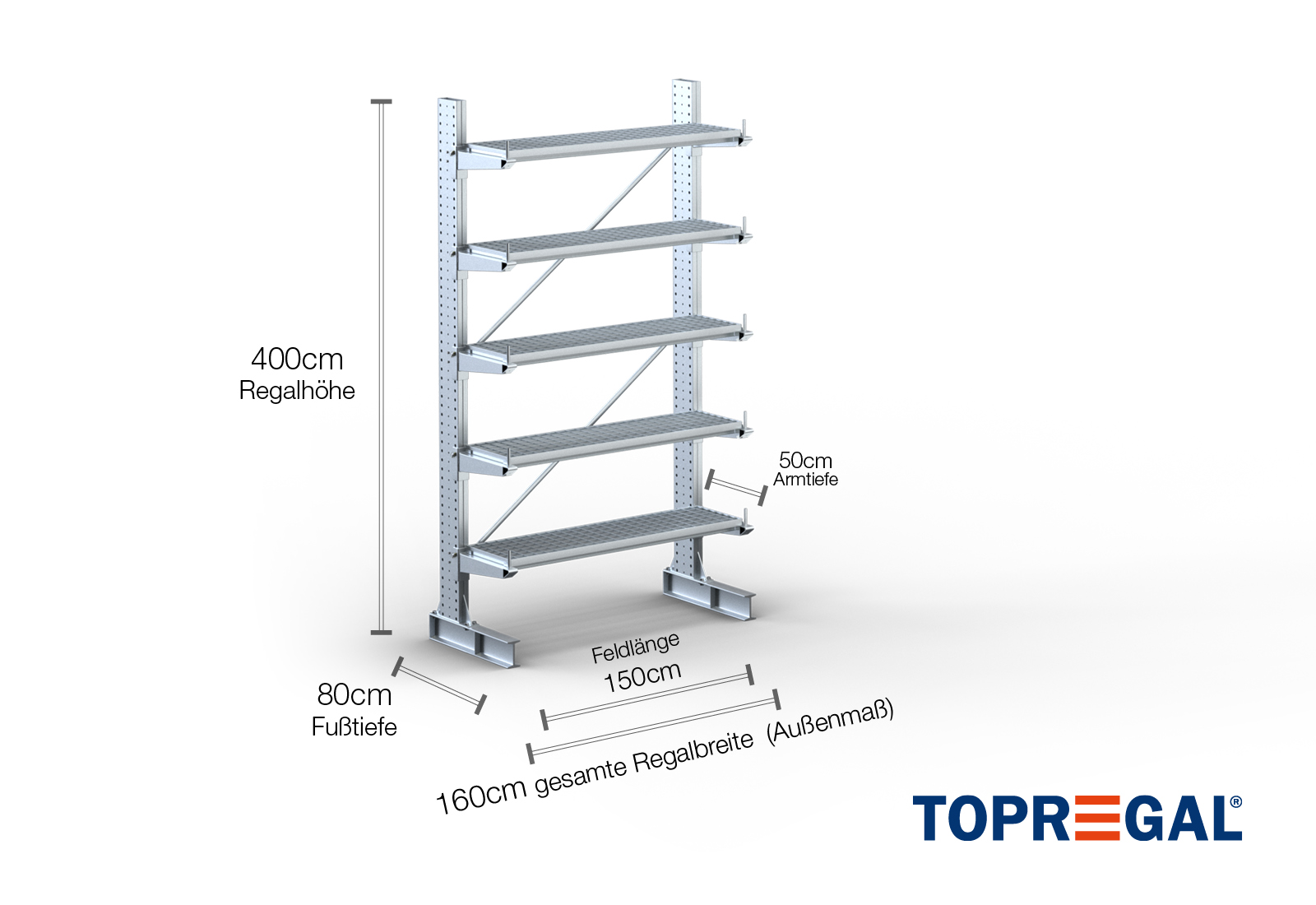 1,6 m cantilever rack KR3000 / Hot-dip galvanised / One-sided / 4 m high / 50 cm cantilever depth / 5 levels / rack layer Galvanised mesh
