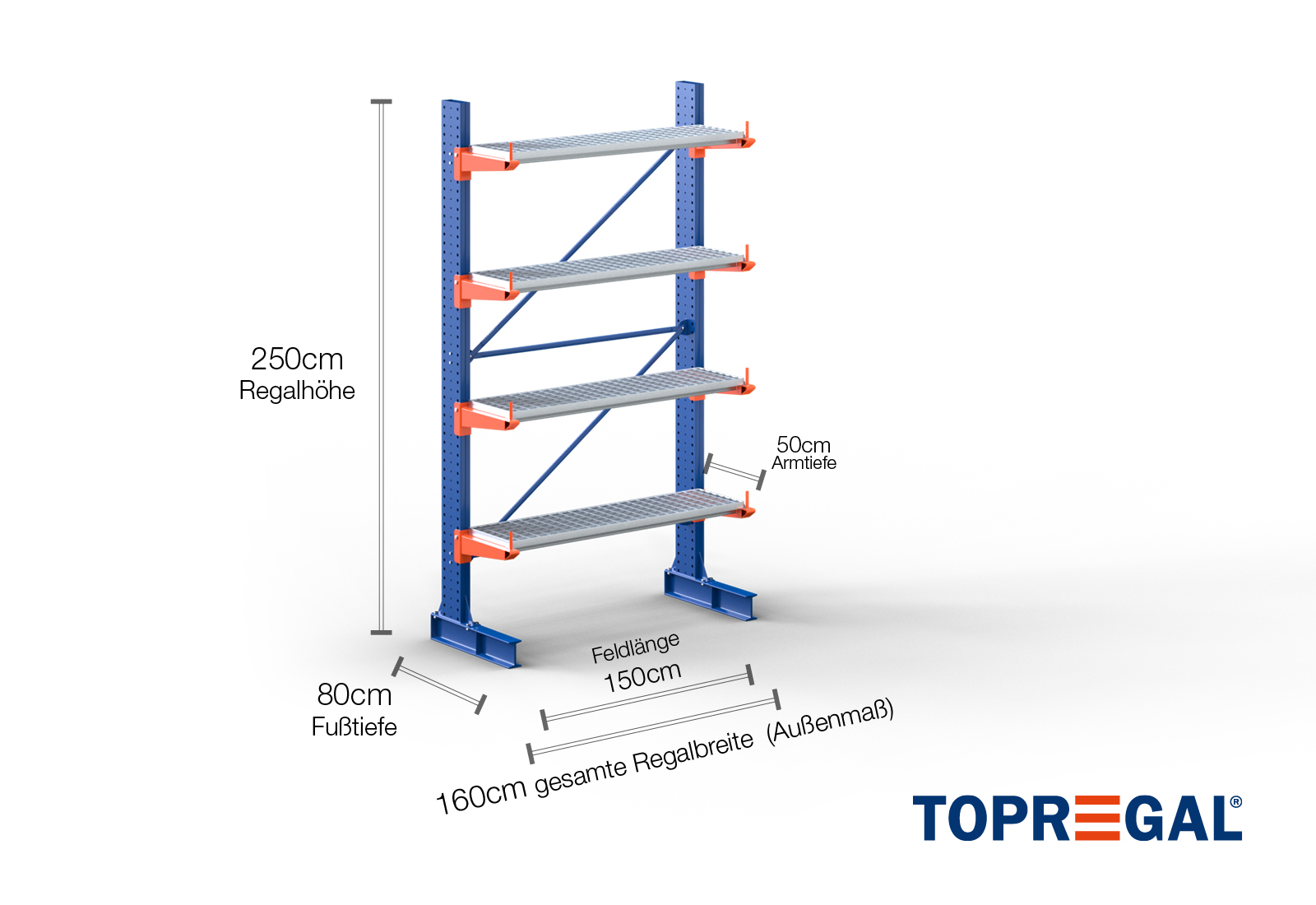 1,6 m cantilever rack KR3000 / Painted / One-sided / 2,5 m high / 4 levels / 50 cm cantilever depth / rack layer Galvanised mesh