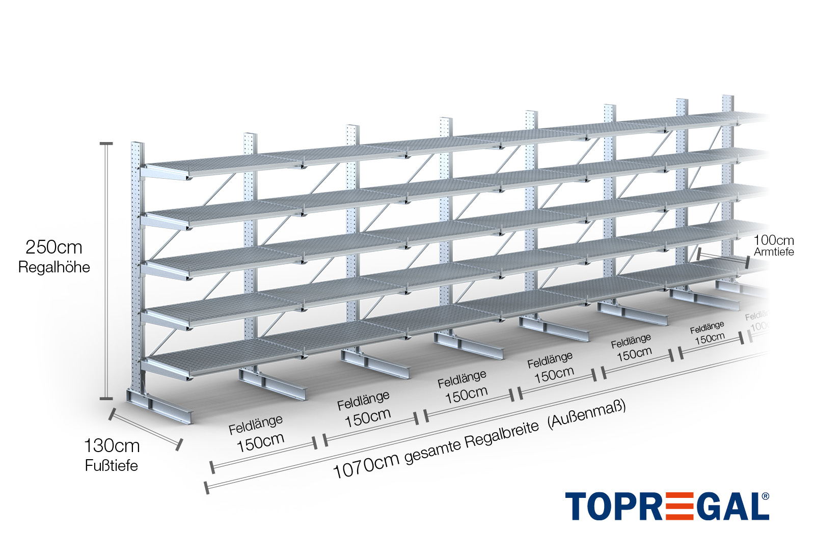 10,7 m cantilever rack KR3000 / Hot-dip galvanised / One-sided / 2,5 m high / 100 cm cantilever depth / 5 levels / rack layer Galvanised mesh