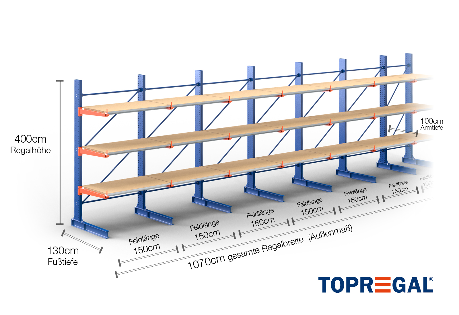 10,7 m cantilever rack KR3000 / Painted / One-sided / 4 m high / 100 cm cantilever depth / 3 levels / rack layer Wood
