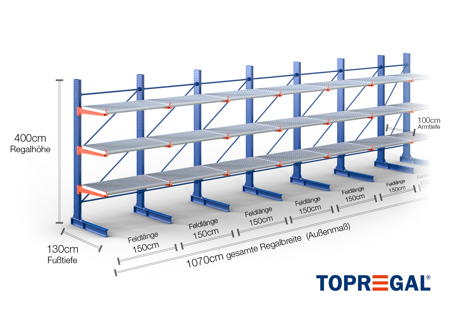 The axial dimension is the internal dimension between two shelf uprights. Depending on the cantilever type, we offer these fields in 120 cm (KR2500) and in 100 cm / 150 cm (KR3000 / KR6000).
