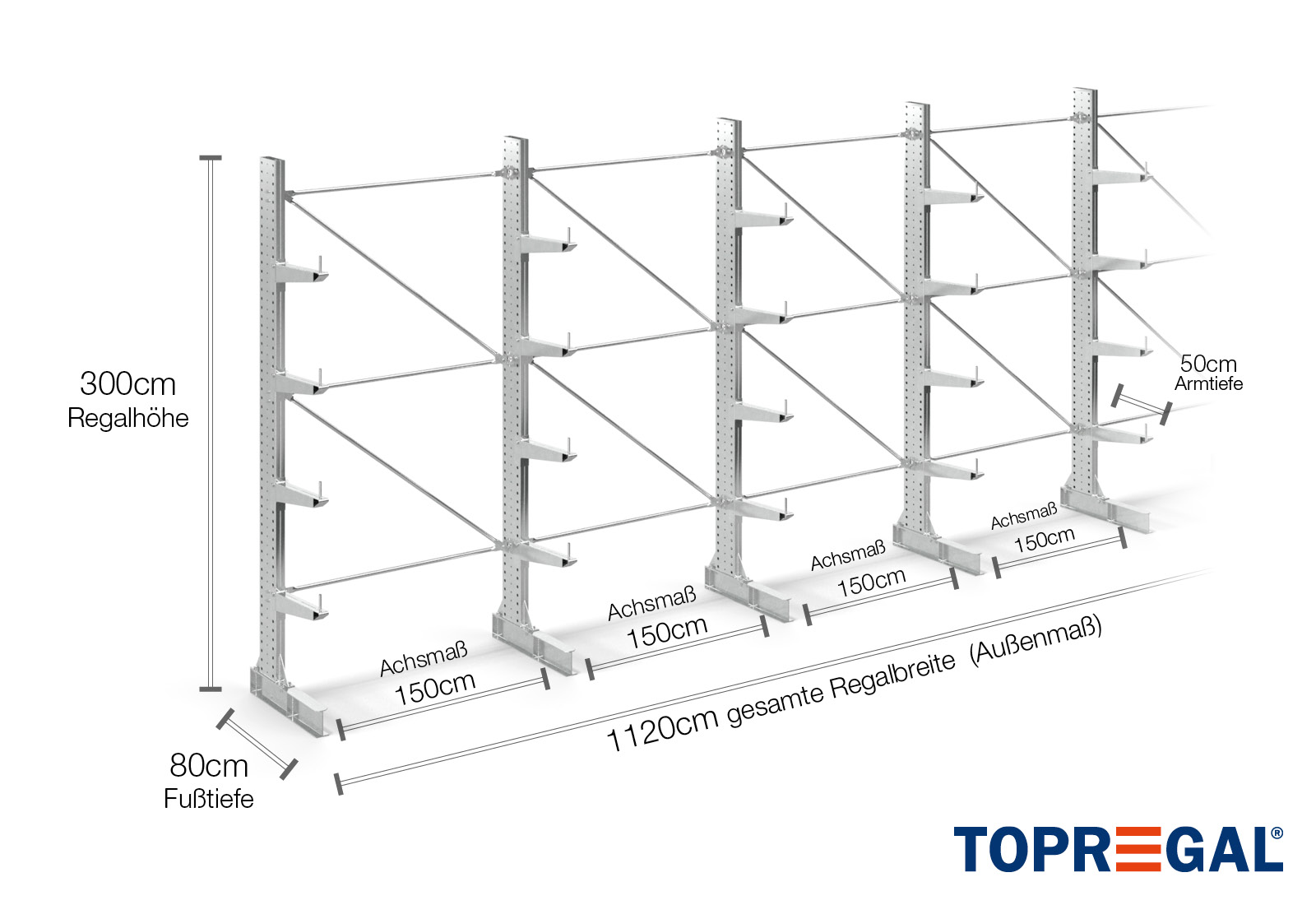 The axial dimension is the internal dimension between two shelf uprights. Depending on the cantilever type, we offer these fields in 120 cm (KR2500) and in 100 cm / 150 cm (KR3000 / KR6000).