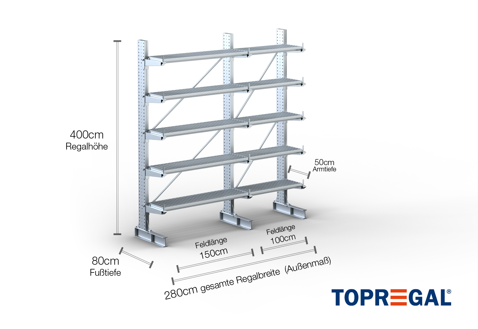 2,8 m cantilever rack KR3000 / Hot-dip galvanised / One-sided / 4 m high / 50 cm cantilever depth / 5 levels / rack layer Galvanised mesh
