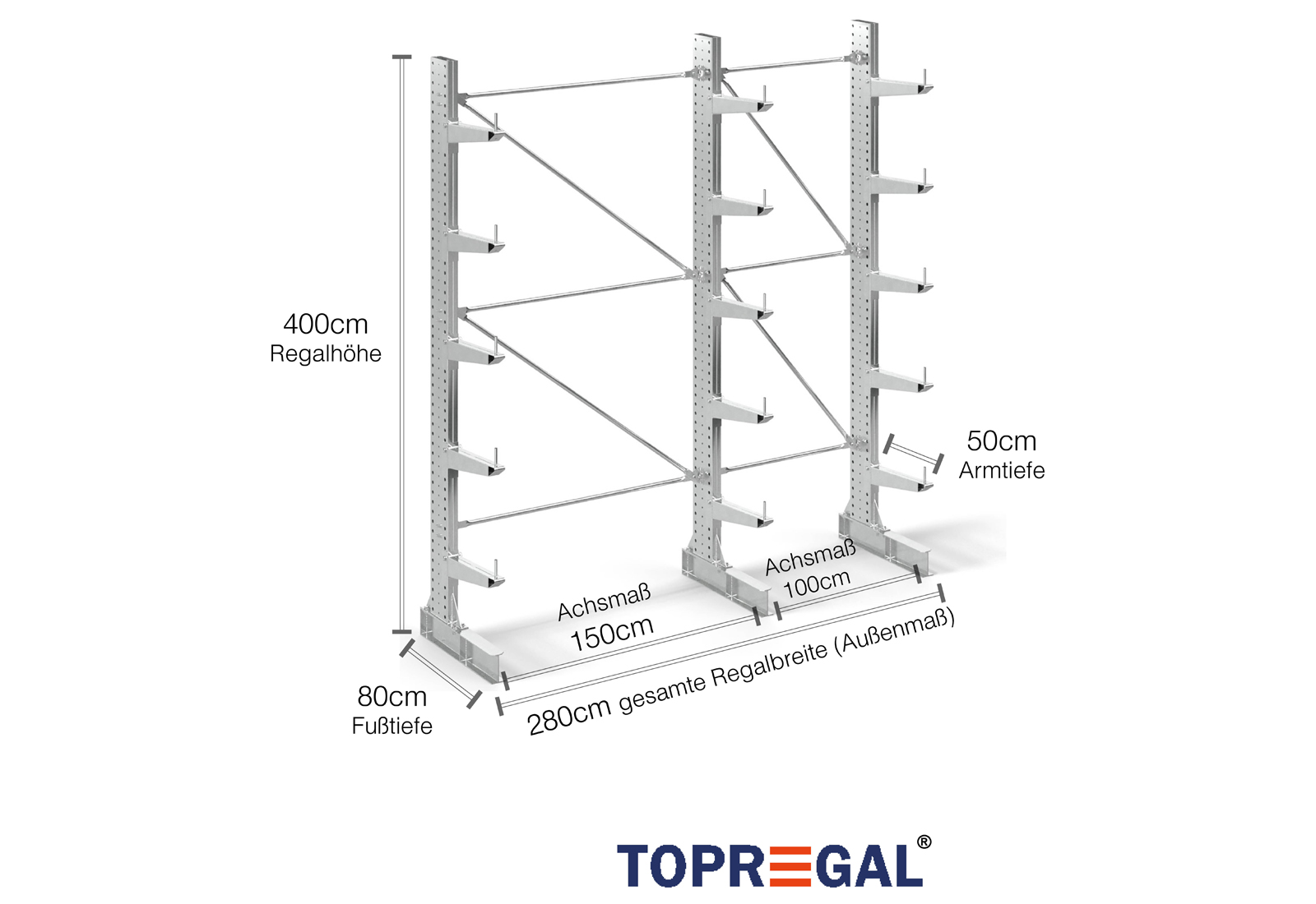 The axial dimension is the internal dimension between two shelf uprights. Depending on the cantilever type, we offer these fields in 120 cm (KR2500) and in 100 cm / 150 cm (KR3000 / KR6000).