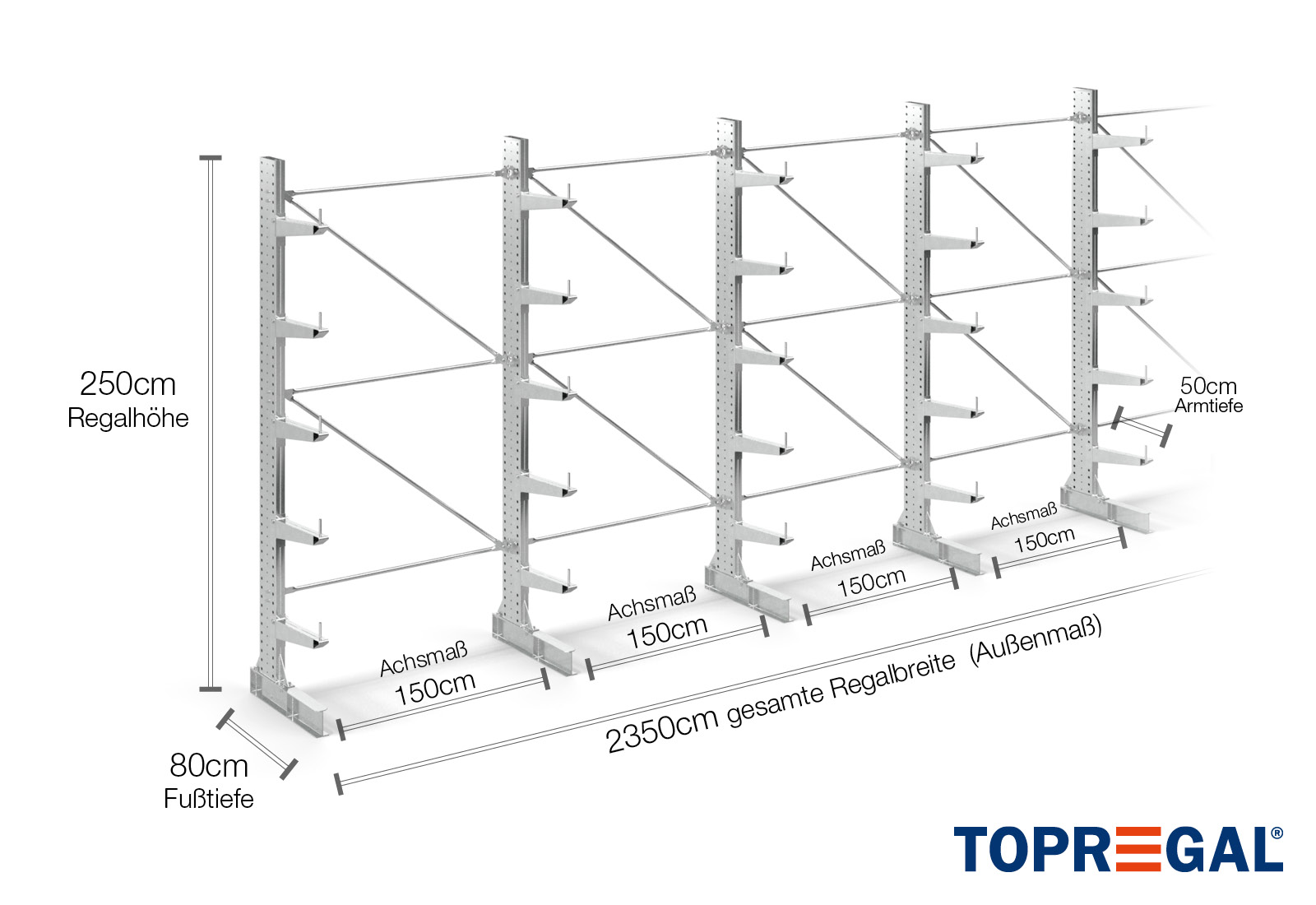 The axial dimension is the internal dimension between two shelf uprights. Depending on the cantilever type, we offer these fields in 120 cm (KR2500) and in 100 cm / 150 cm (KR3000 / KR6000).