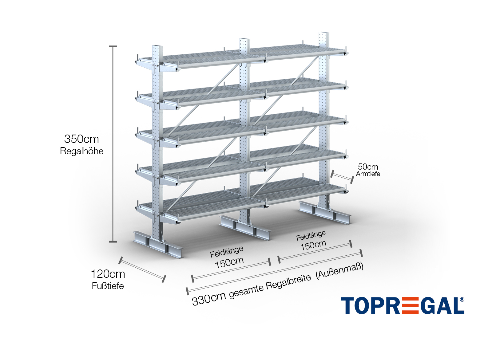 3,3 m cantilever rack KR3000 / Hot-dip galvanised / Double-sided / 3,5 m high / 50 cm cantilever depth / 5 levels / rack layer Galvanised mesh