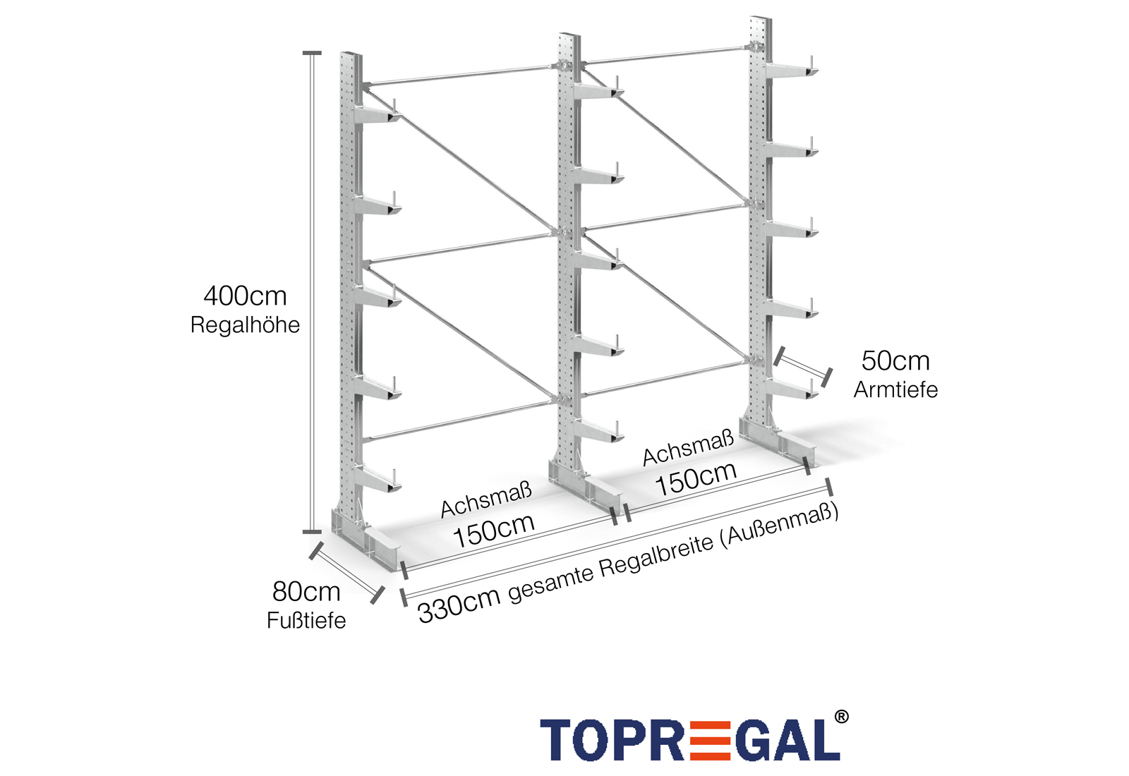 The axial dimension is the internal dimension between two shelf uprights. Depending on the cantilever type, we offer these fields in 120 cm (KR2500) and in 100 cm / 150 cm (KR3000 / KR6000).
