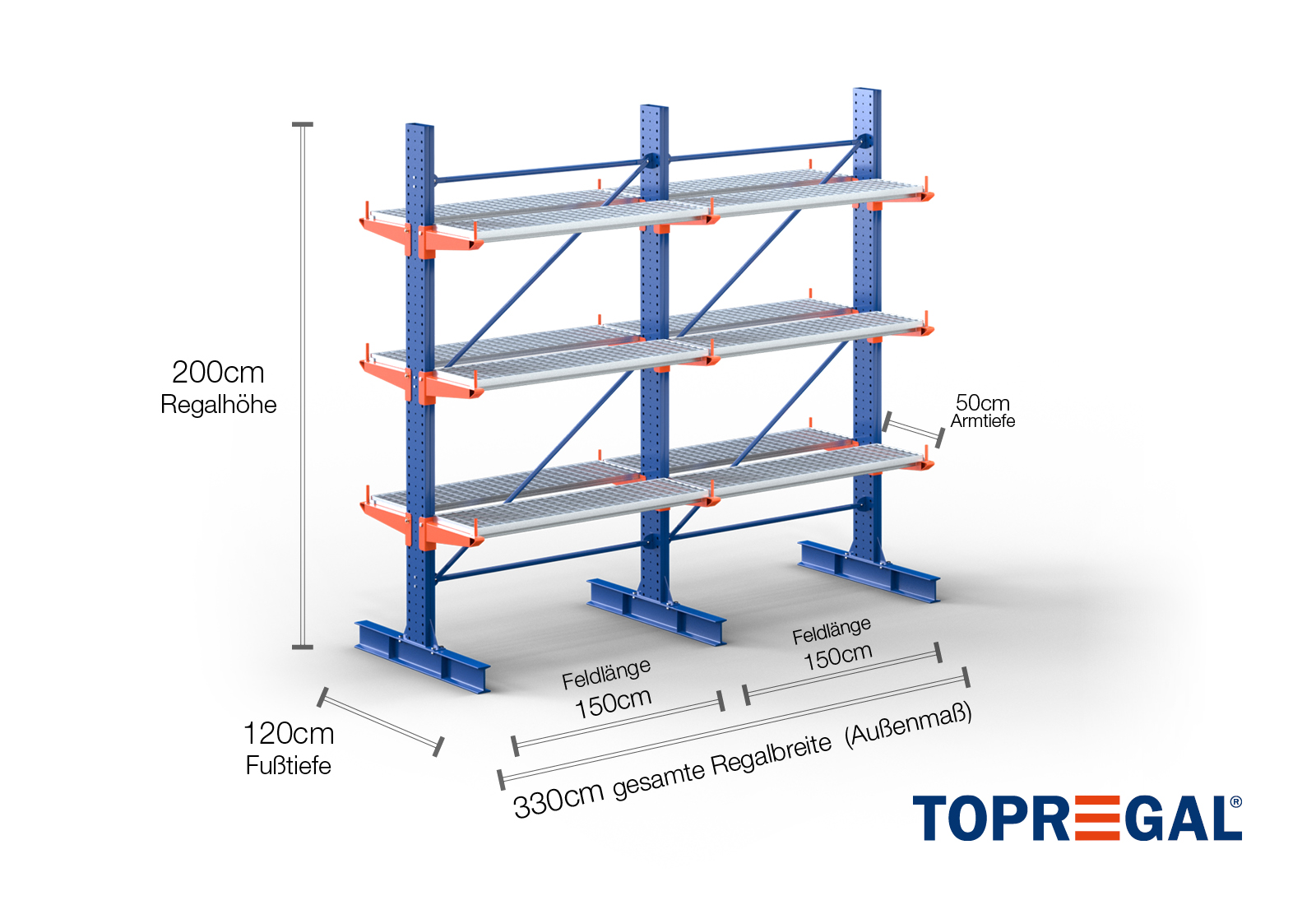 3,3 m cantilever rack KR3000 / Painted / Double-sided / 2 m high / 50 cm cantilever depth / 3 levels / rack layer Galvanised mesh