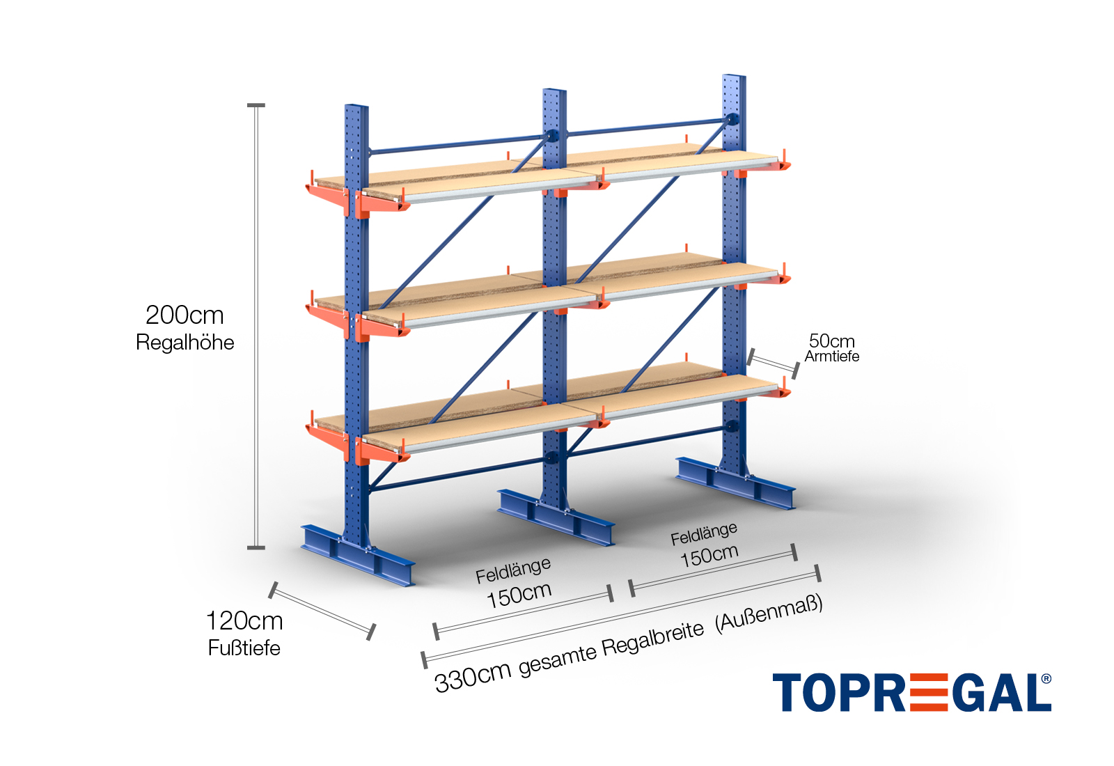 3,3 m cantilever rack KR3000 / Painted / Double-sided / 2 m high / 50 cm cantilever depth / 3 levels / rack layer Wood