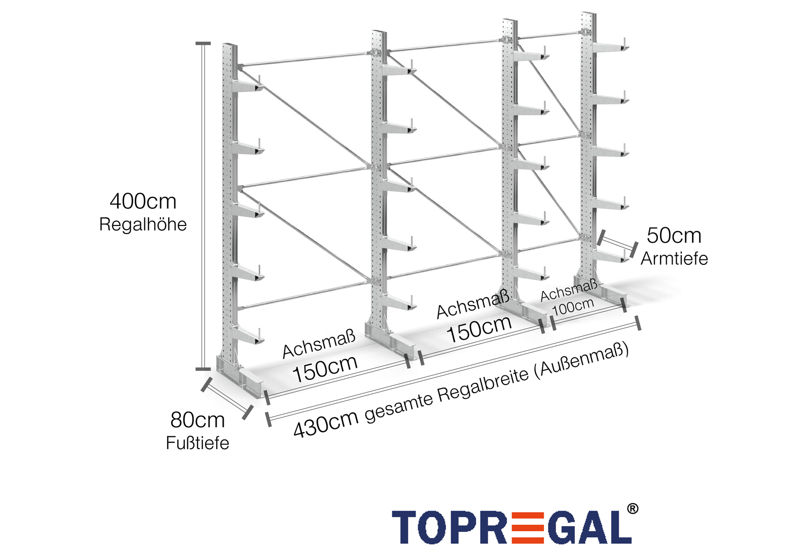 The axial dimension is the internal dimension between two shelf uprights. Depending on the cantilever type, we offer these fields in 120 cm (KR2500) and in 100 cm / 150 cm (KR3000 / KR6000).