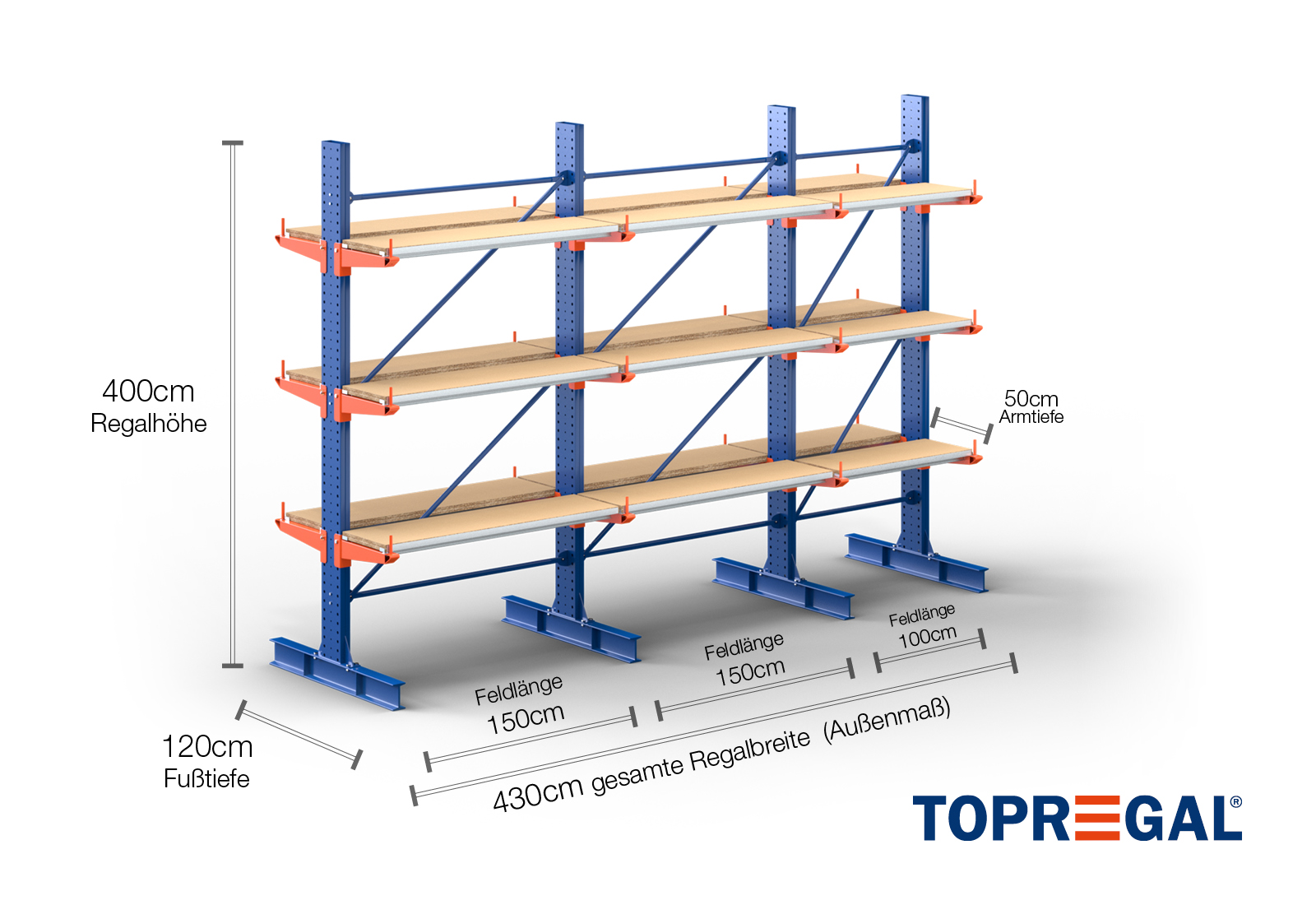 4,3 m cantilever rack KR3000 / Painted / Double-sided / 4 m high / 50 cm cantilever depth / 3 levels / rack layer Wood