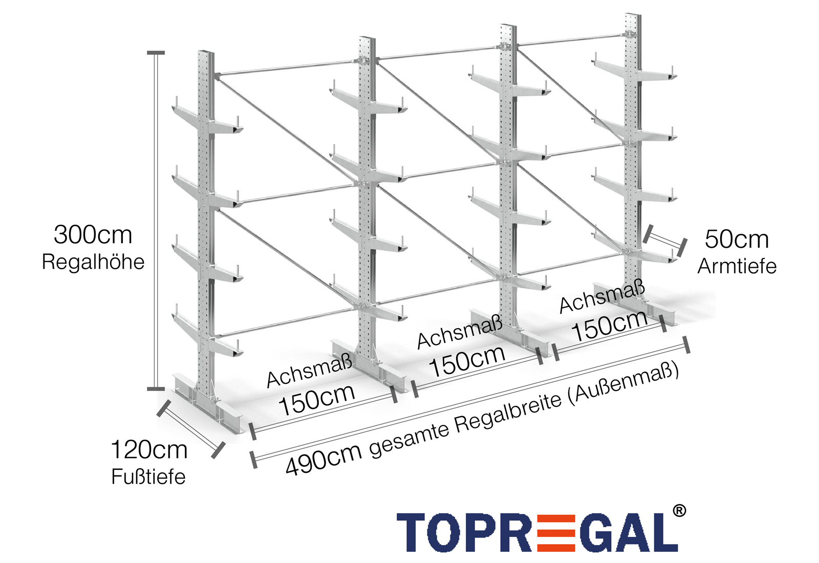 The axial dimension is the internal dimension between two shelf uprights. Depending on the cantilever type, we offer these fields in 120 cm (KR2500) and in 100 cm / 150 cm (KR3000 / KR6000).