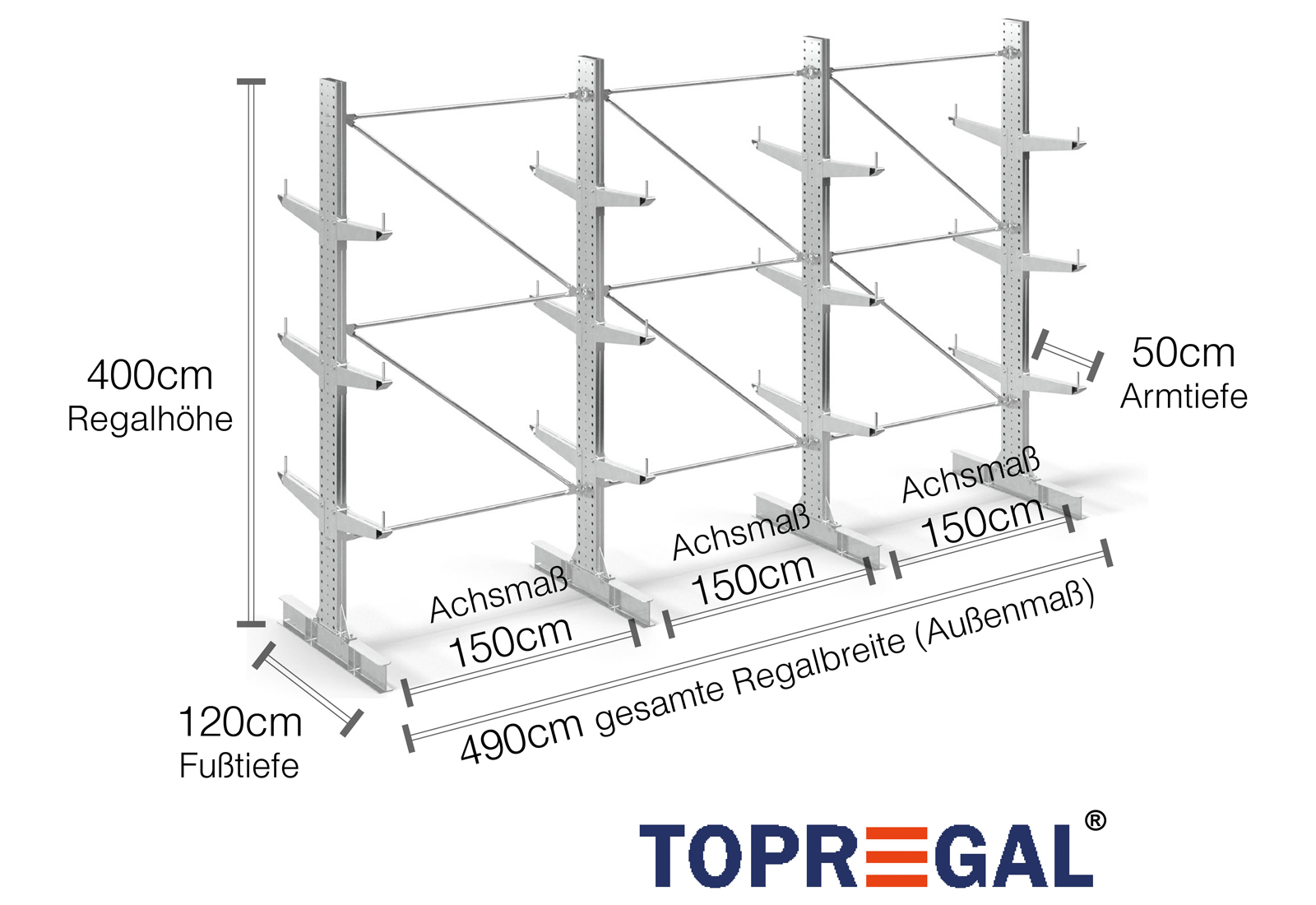 The axial dimension is the internal dimension between two shelf uprights. Depending on the cantilever type, we offer these fields in 120 cm (KR2500) and in 100 cm / 150 cm (KR3000 / KR6000).