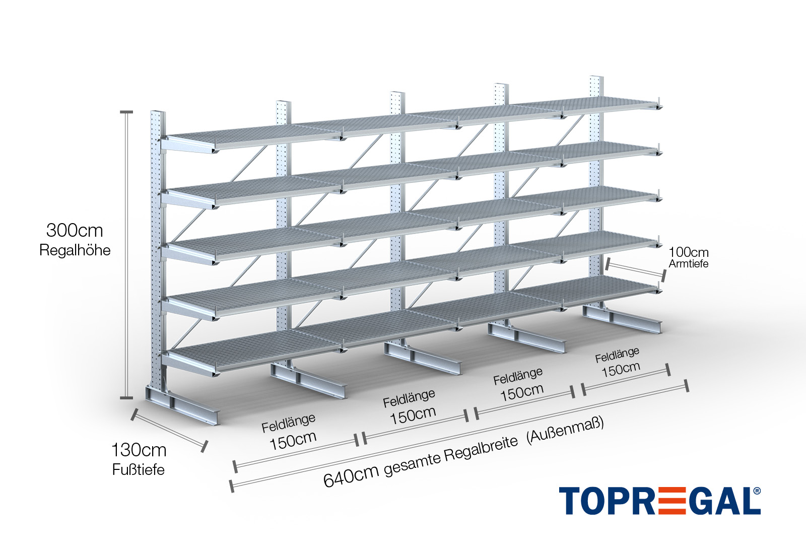 6,4 m cantilever rack KR3000 / Hot-dip galvanised / One-sided / 3 m high / 100 cm cantilever depth / 5 levels / rack layer Galvanised mesh
