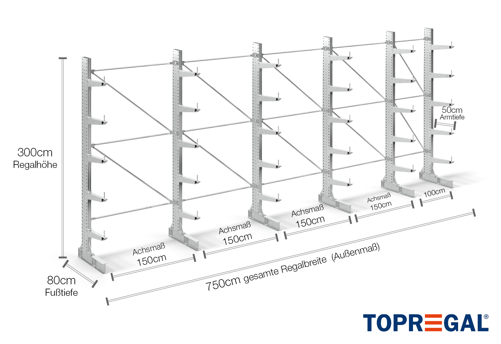 7,5 m cantilever rack KR3000 / Hot-dip galvanised / One-sided / 3 m high / 50 cm cantilever depth / 5 levels