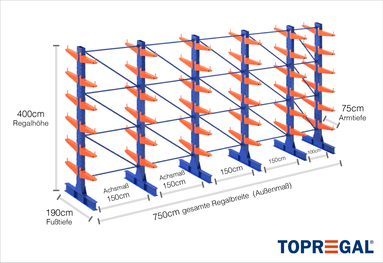 7,5 m cantilever rack KR6000 / Painted / Double-sided / 4 m high / 75 cm cantilever depth / 6 levels