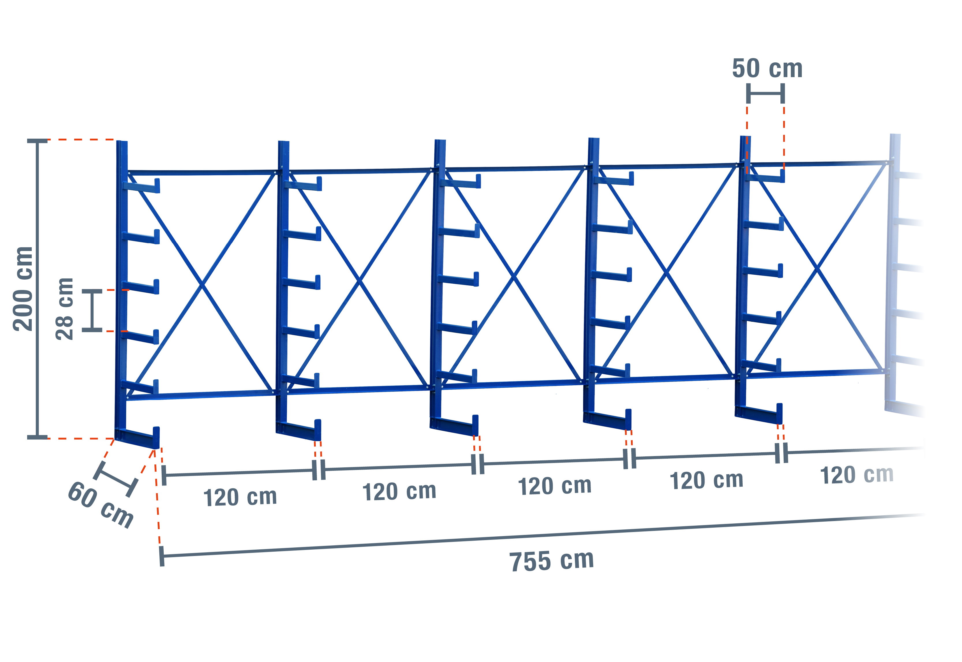 This extra-robust cantilever rack with a width of 7,55 m is 2 m high and has 5 levels with a cantilever depth of 50 cm. Thanks to the single-sided design with welded-on cantilever arms, you can load each upright with a maximum of 1.250 kg, where each cantilever has a maximum load of 250 kg.