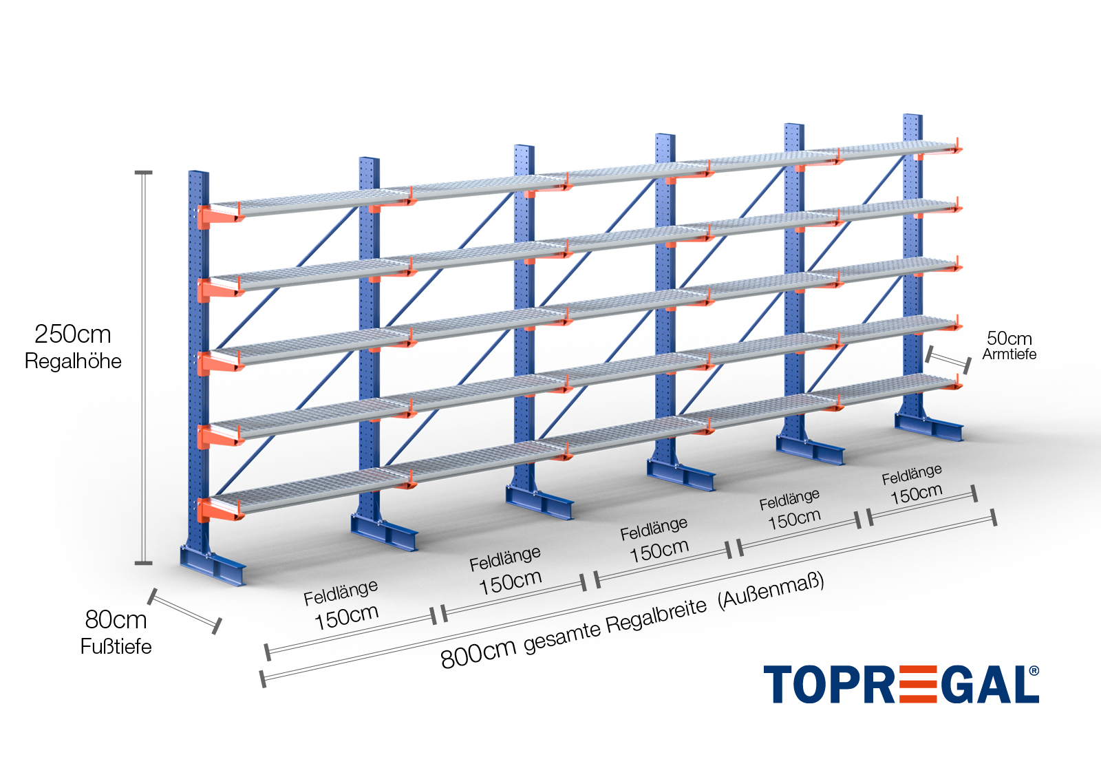 The axial dimension is the internal dimension between two shelf uprights. Depending on the cantilever type, we offer these fields in 120 cm (KR2500) and in 100 cm / 150 cm (KR3000 / KR6000).