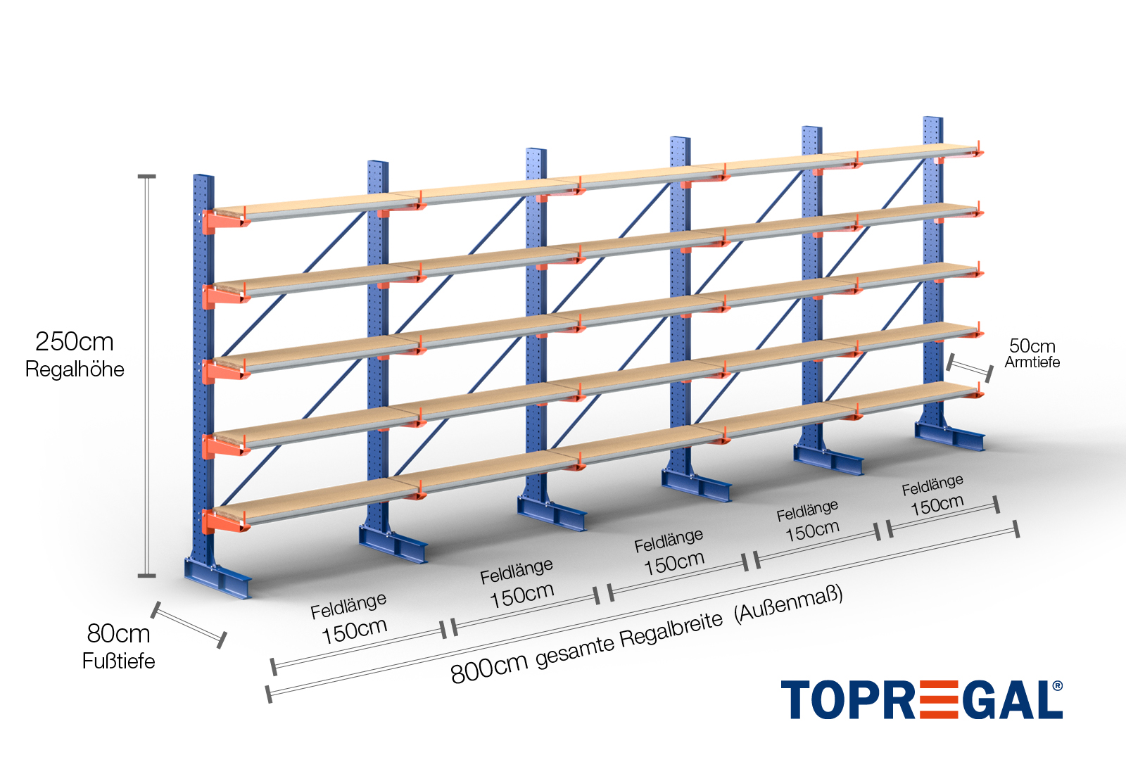 8 m cantilever rack KR3000 / Painted / One-sided / 2,5 m high / 50 cm cantilever depth / 5 levels / rack layer Wood