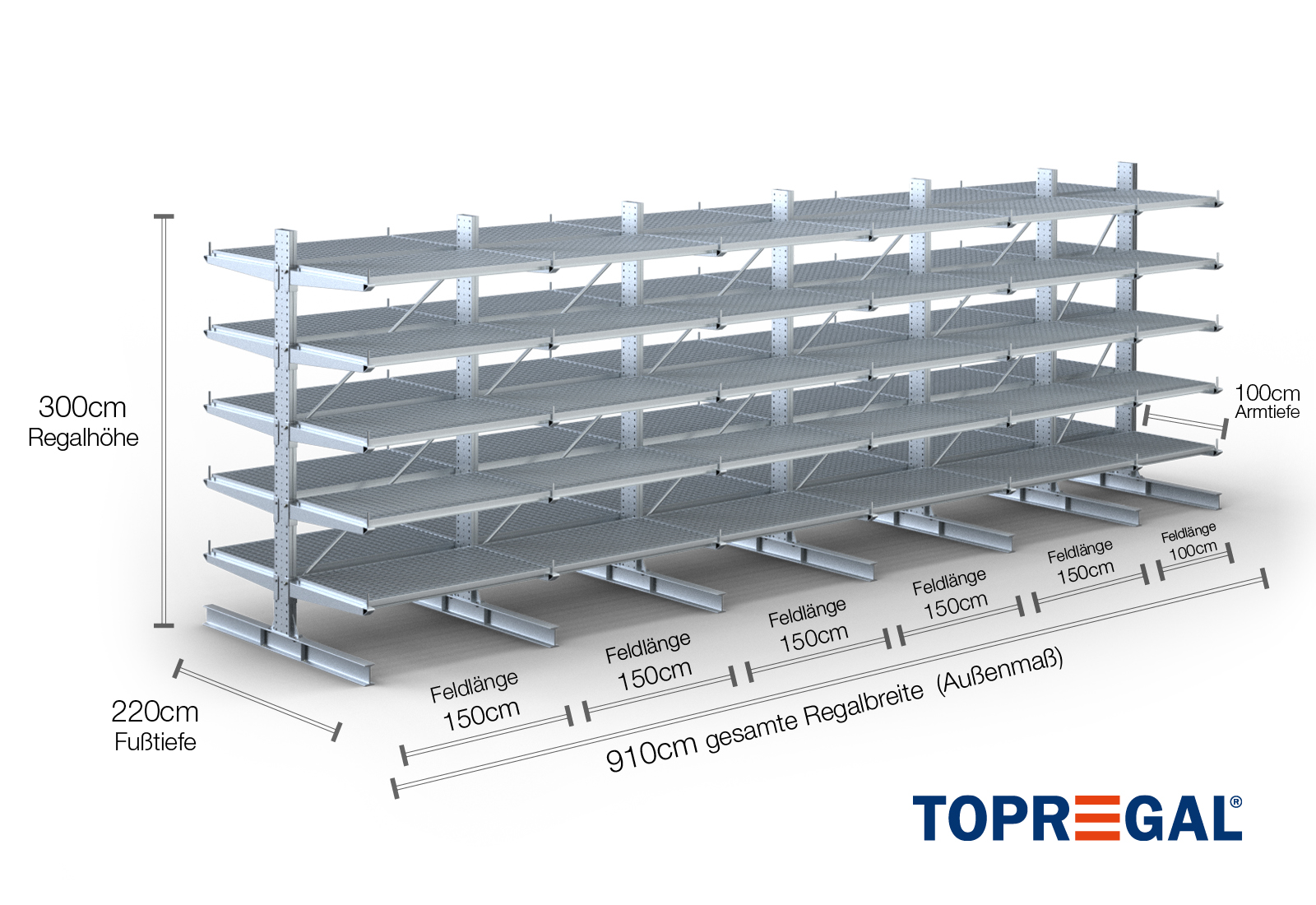 This cantilever rack in a double-sided design with a width of 9,1 m is 3 m high, with an overall depth of 220 cm, and features 5 cantilever levels, with a cantilever depth of 100 cm. The maximum load per cantilever is 500 kg. The cantilevers can be attached at individual heights in increments of 50 mm and are secured with safety bolts and pins. The foot parts can also be used as a storage level (depending on the goods). To protect the load from accidentally slipping, roll-off protection can be attached at the end of each cantilever. This is included as standard in the delivery volume. The maximum unit load capacity (even total load between two uprights) is 3.000 kg.