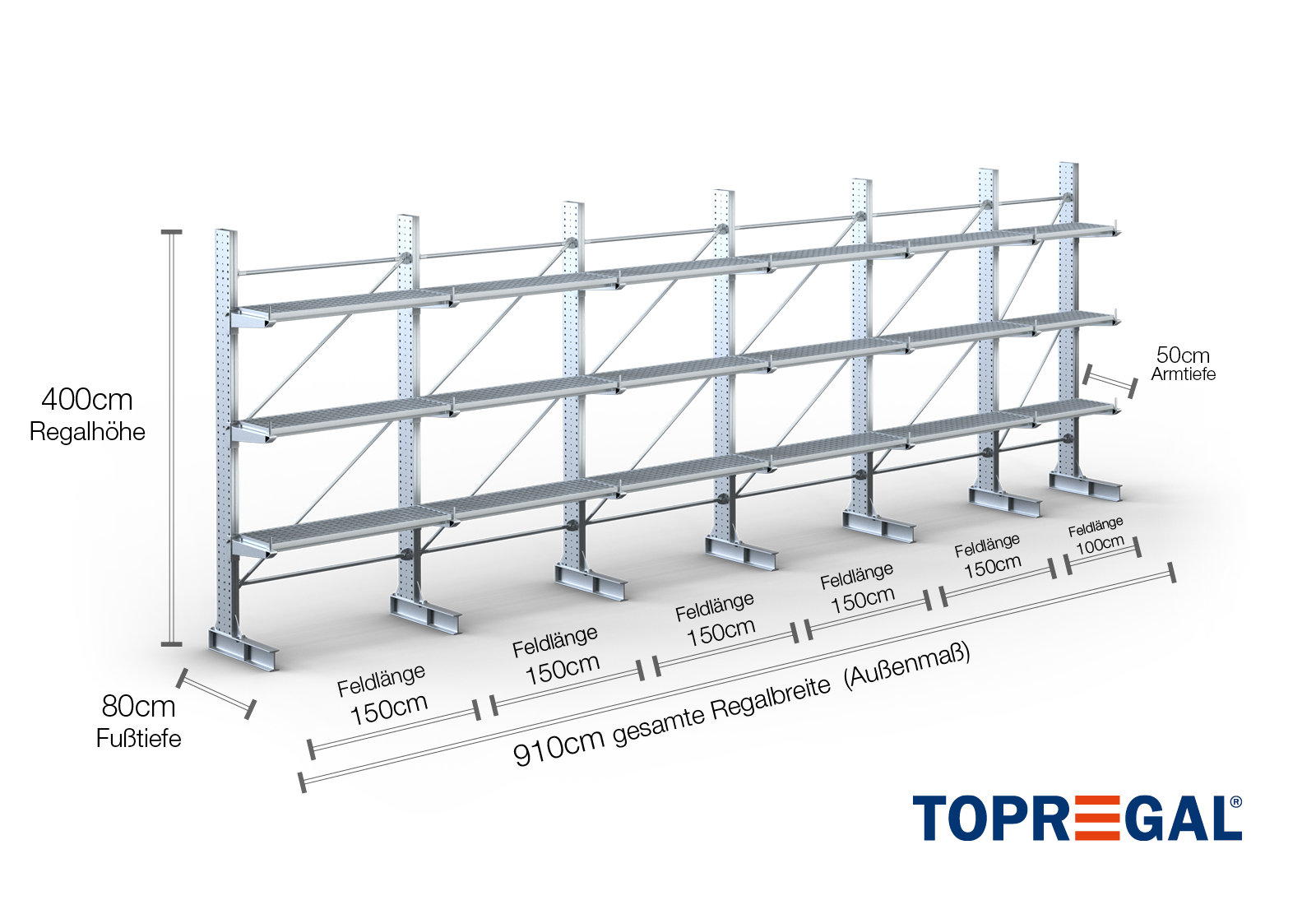The axial dimension is the internal dimension between two shelf uprights. Depending on the cantilever type, we offer these fields in 120 cm (KR2500) and in 100 cm / 150 cm (KR3000 / KR6000).