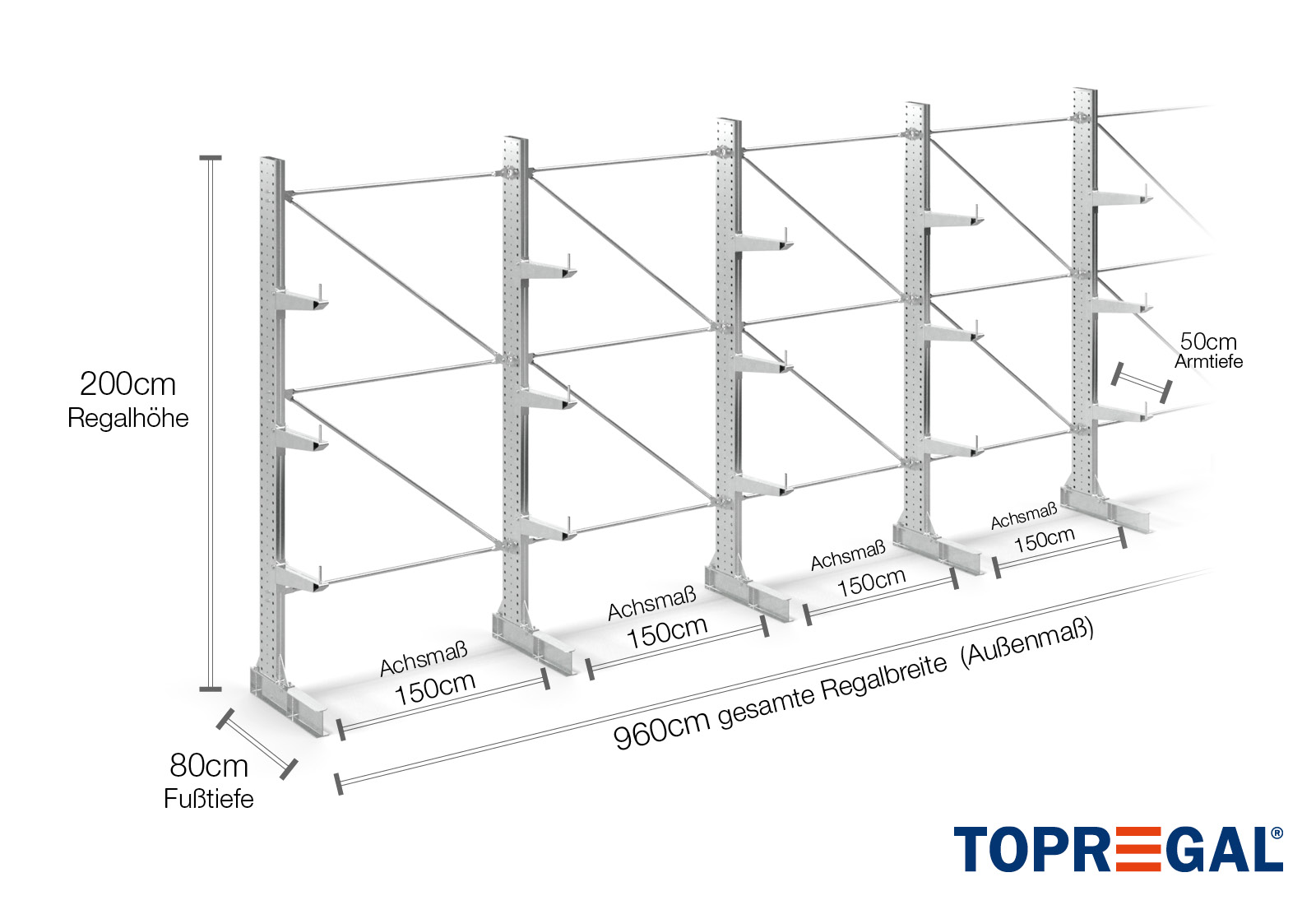 The axial dimension is the internal dimension between two shelf uprights. Depending on the cantilever type, we offer these fields in 120 cm (KR2500) and in 100 cm / 150 cm (KR3000 / KR6000).