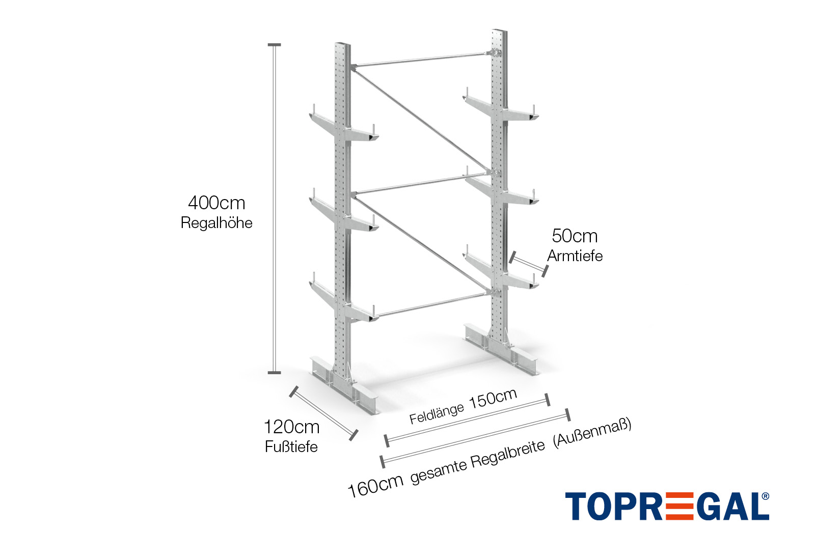 1,6 m cantilever rack KR3000 / Hot-dip galvanised / Double-sided / 4 m high / 50 cm cantilever depth / 3 levels