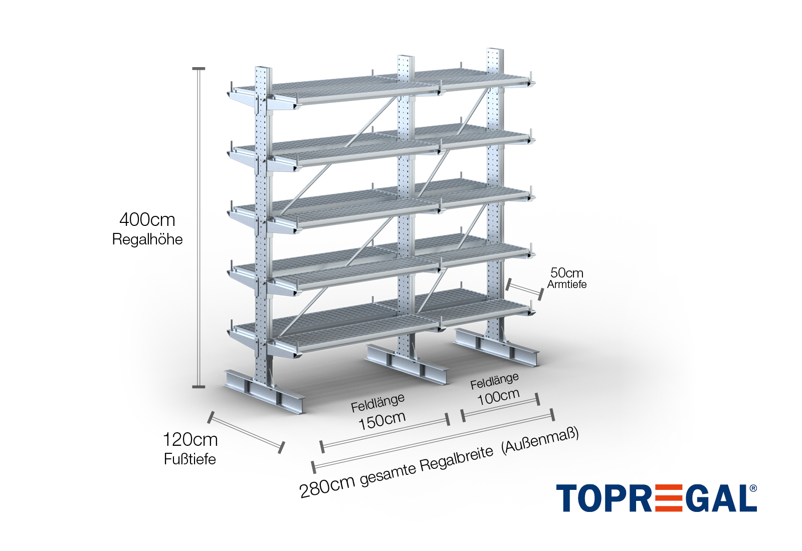 2,8 m cantilever rack KR3000 / Hot-dip galvanised / Double-sided / 4 m high / 50 cm cantilever depth / 5 levels / rack layer Galvanised mesh