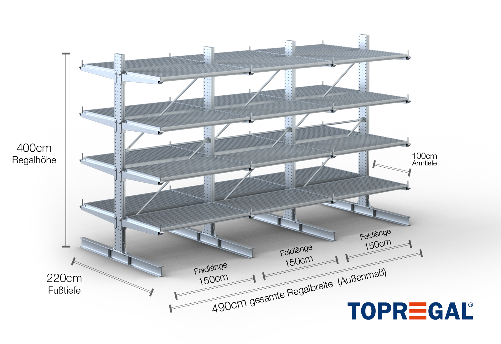 This cantilever rack in a double-sided design with a width of 4,9 m is 4 m high, with an overall depth of 220 cm, and features 4 cantilever levels, with a cantilever depth of 100 cm. The maximum load per cantilever is 500 kg. The cantilevers can be attached at individual heights in increments of 50 mm and are secured with safety bolts and pins. The foot parts can also be used as a storage level (depending on the goods). To protect the load from accidentally slipping, roll-off protection can be attached at the end of each cantilever. This is included as standard in the delivery volume. The maximum unit load capacity (even total load between two uprights) is 3.000 kg.