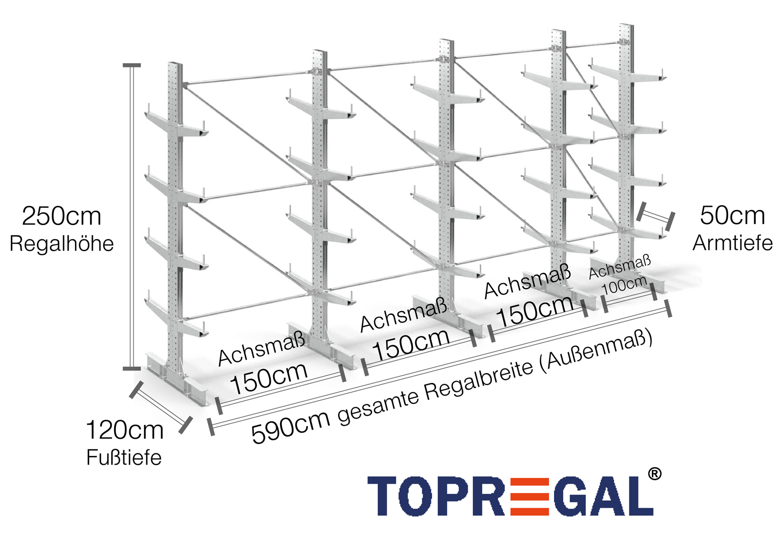 The axial dimension is the internal dimension between two shelf uprights. Depending on the cantilever type, we offer these fields in 120 cm (KR2500) and in 100 cm / 150 cm (KR3000 / KR6000).