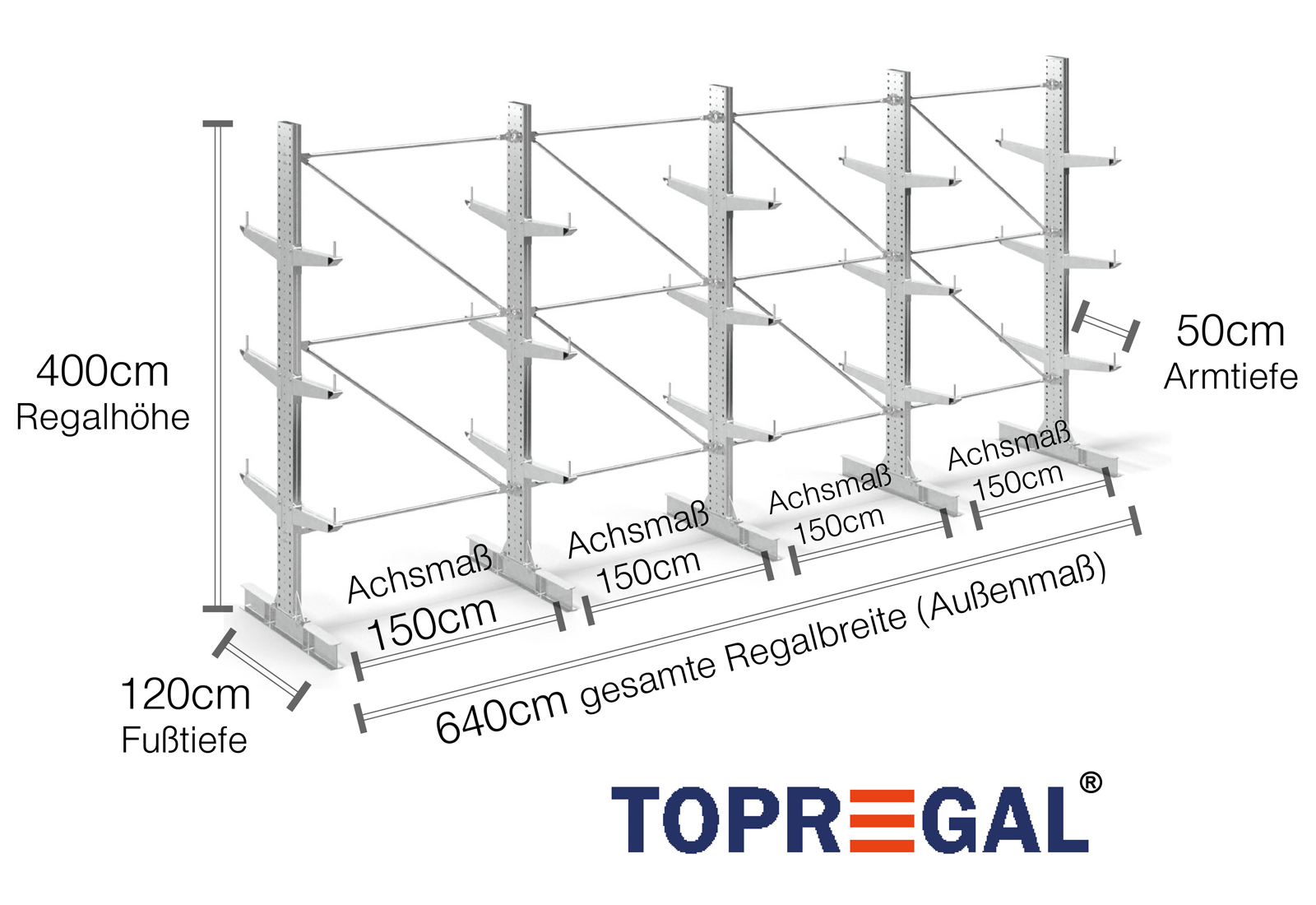 The axial dimension is the internal dimension between two shelf uprights. Depending on the cantilever type, we offer these fields in 120 cm (KR2500) and in 100 cm / 150 cm (KR3000 / KR6000).