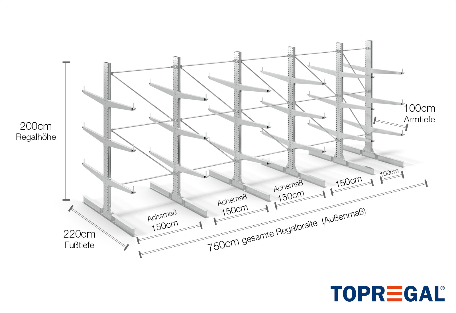 The axial dimension is the internal dimension between two shelf uprights. Depending on the cantilever type, we offer these fields in 120 cm (KR2500) and in 100 cm / 150 cm (KR3000 / KR6000).