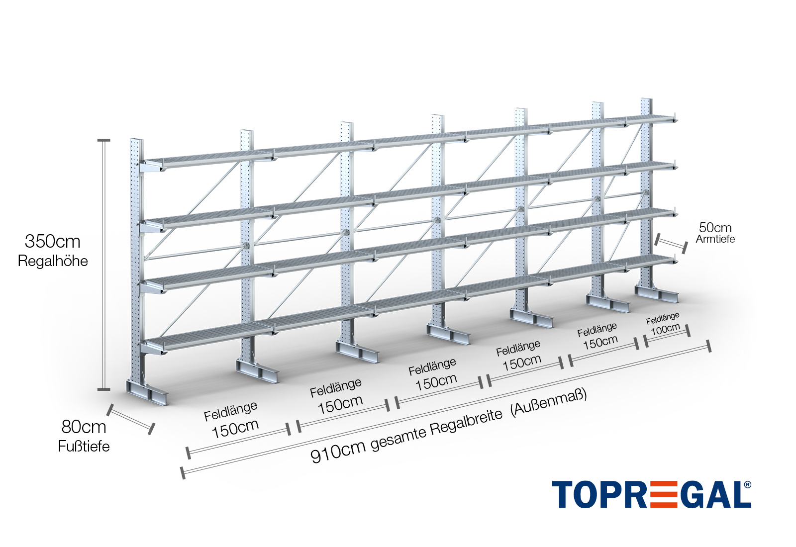 9,1 m cantilever rack KR3000 / Hot-dip galvanised / One-sided / 3,5 m high / 50 cm cantilever depth / 4 levels / rack layer Galvanised mesh
