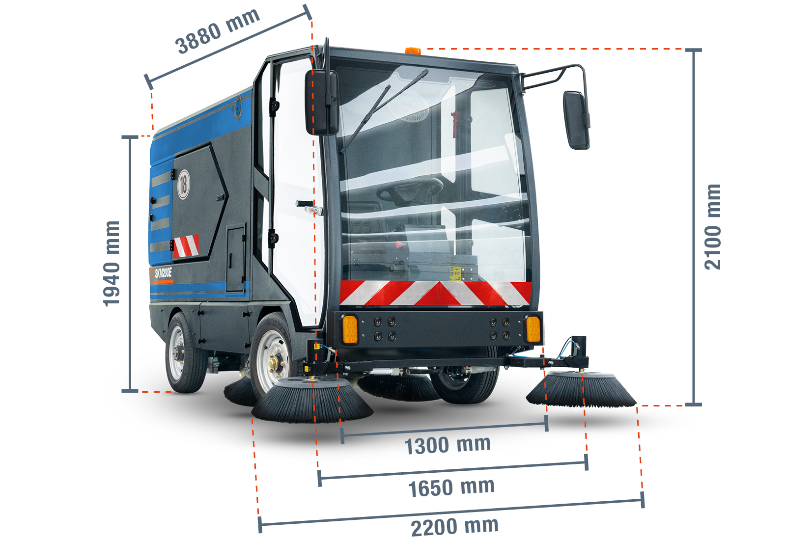 The SKM200E measures 2.200 mm x 3.880 mm x 2.100 mm and has a main brush and four side brushes made of high-quality PP bristle material. The cleaning width of 2.200 mm and the rotation speed of the brushes of 180 rpm ensure effective and thorough cleaning. The SKM200E copes with inclines of up to 20 % and reaches a maximum speed of 18 km/h.