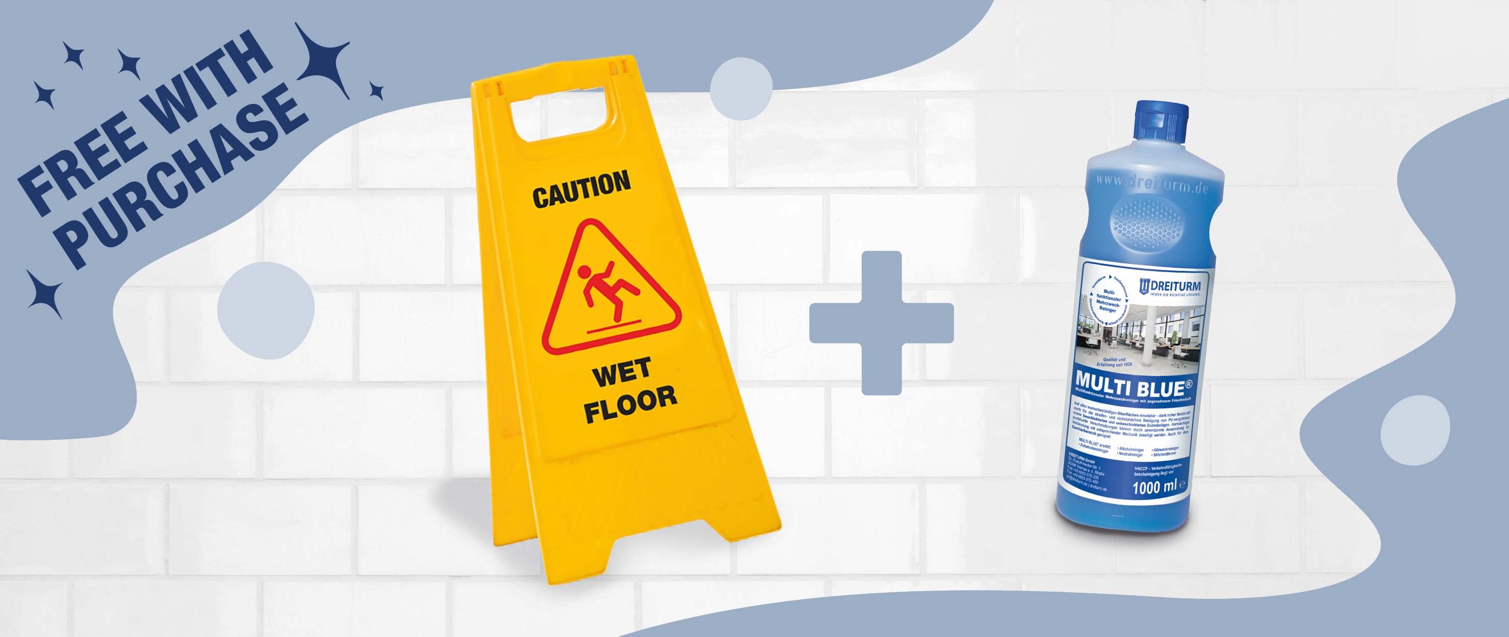 For free: Every online purchase of our scrubber dryers comes with 1 litre of Multi Blue cleaning agent and a warning sign labelled "CAUTION - WET FLOOR" free of charge.